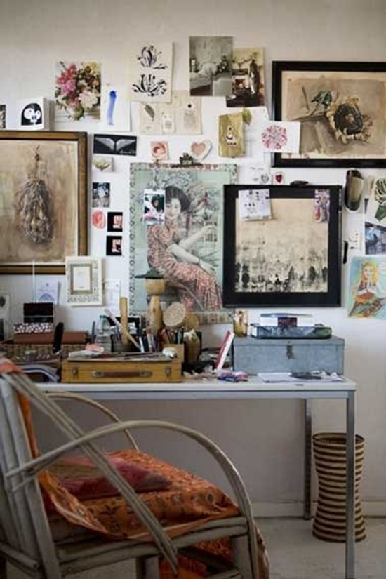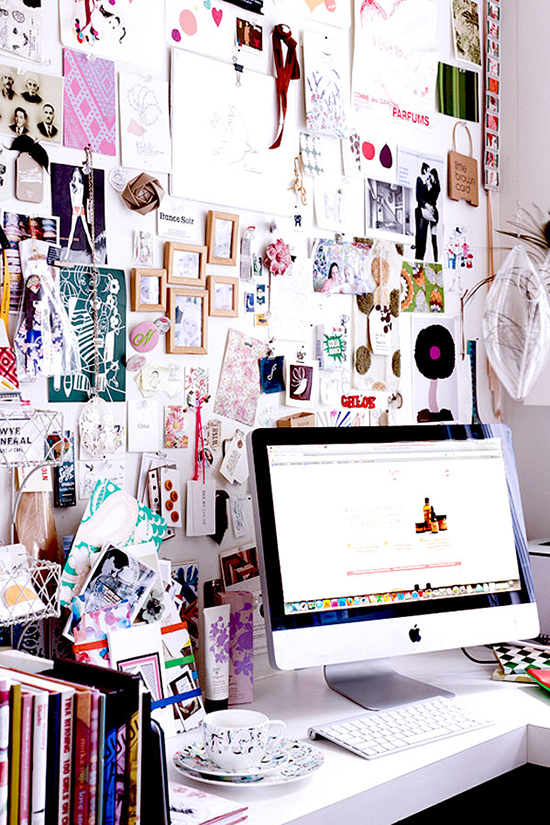 相信每個人桌上的東西一定不少,其實"亂中有序"是很高的境界,在牆上或是辦公隔板上凌亂有序的貼上各種不同的雜誌內頁、紙條、明信片,找一些自己喜歡的圖片,會讓整個辦公桌更有屬於自己的特色,這個佈置的方式幾乎不花錢喔!