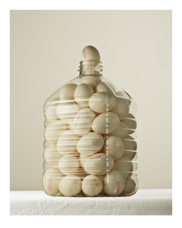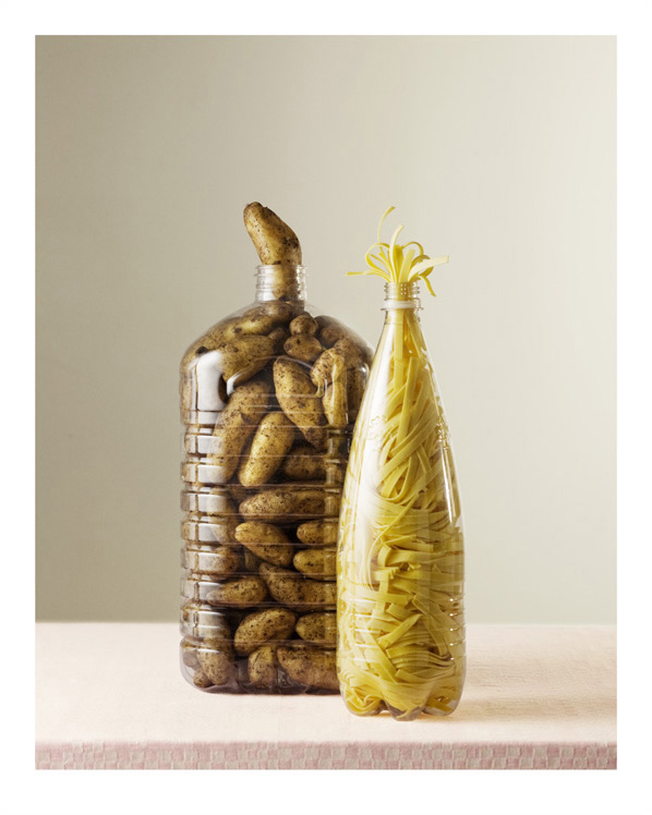 丹麥攝影師 Per Johansen 拍攝了一系列非常奇妙的攝影集,照片中的瓶子都塞滿各式各樣的食材,不管是蔬菜還是雞蛋,都可以看到內容物已經塞到滿過了頭,擠出來的食材突出或是垂掛在瓶口。