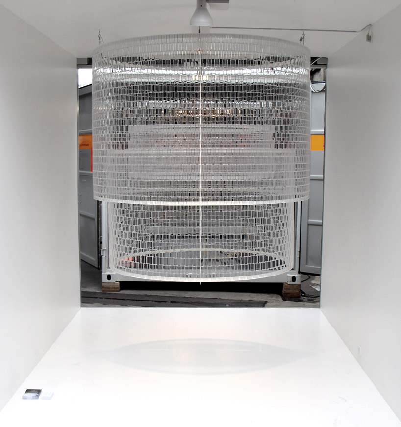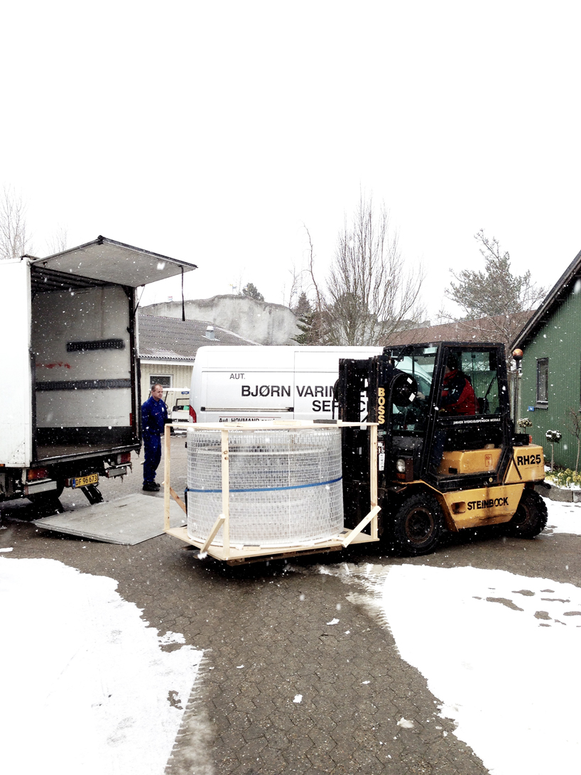 這座 Transparent LEGO 吊燈正在 2013 米蘭設計週會場裡頭展示,這張則是運送過程拍下的照片,不過這座燈遠遠看起來好像包材泡泡紙喔XDD