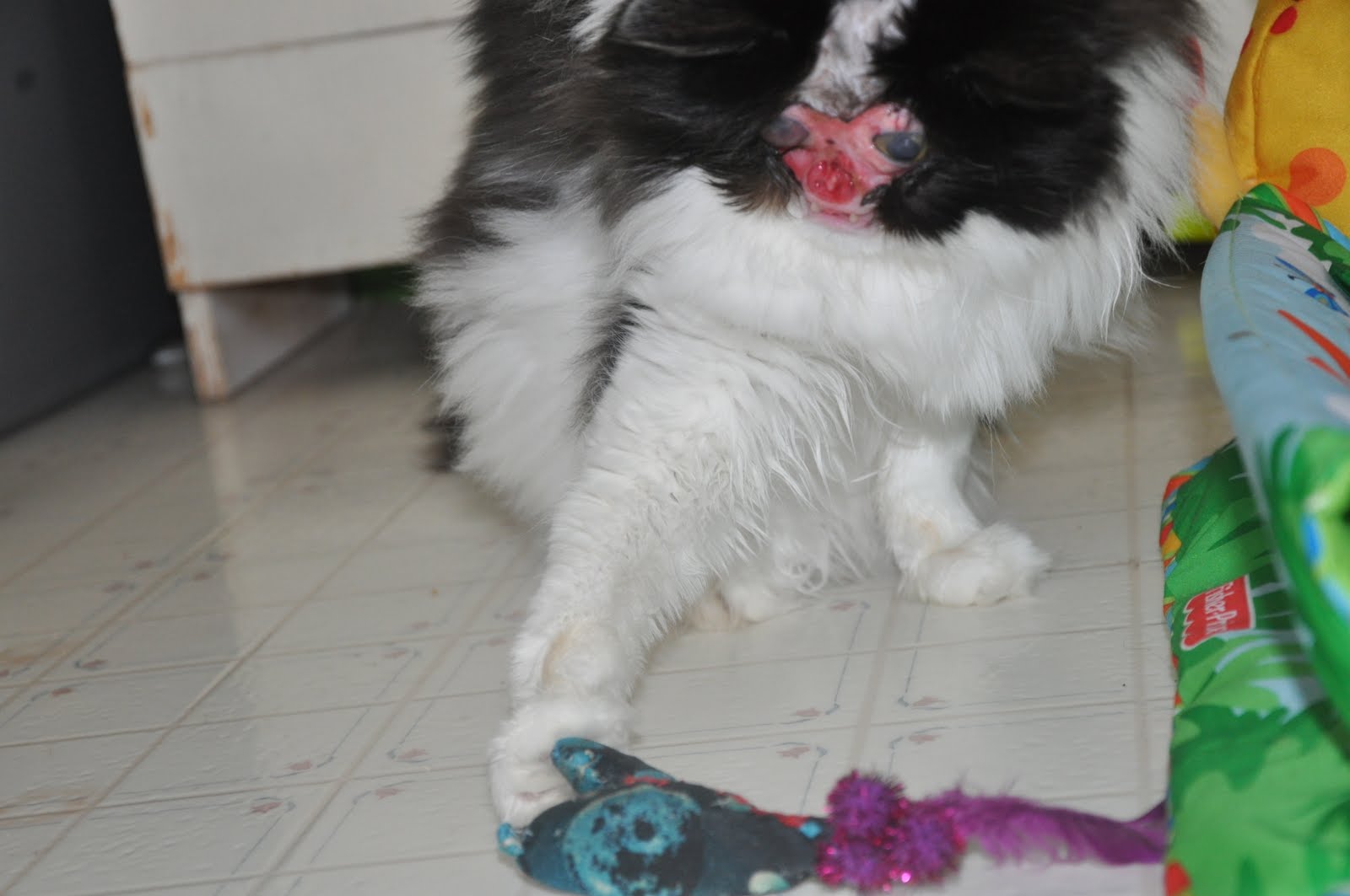 沒有迷人雙目和可愛的臉龐 Chase,其實跟普通的貓咪一樣喜歡睡覺、喝牛奶和撒嬌,和梅爾的孩子們和狗狗相處融洽。即使外表殘破,友善親人的 Chase 仍過的相當幸福。