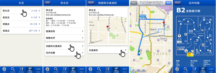 挑的差不多後,接著就是出門血拼啦!要去哪家店比較近呢?「分店資訊」可以幫你規劃交通路線,以及當你在 IKEA 裡面逛到迷路時,立馬拿出你的手機打開「店內地圖」,就能知道你人在哪一區了。