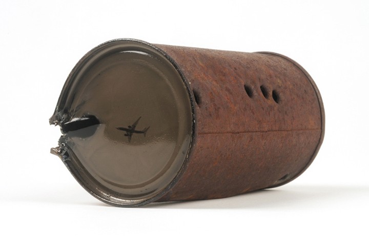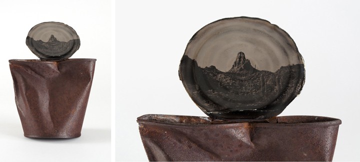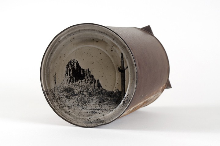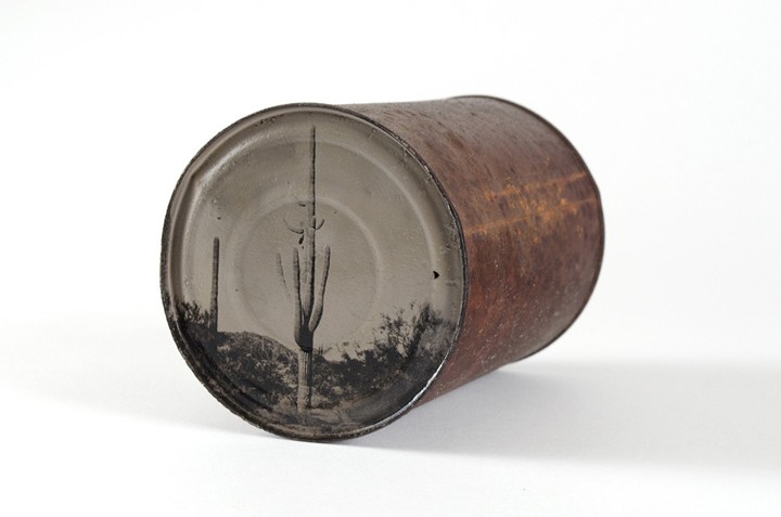 亞歷桑納州出身的攝影師大衛‧艾密特‧亞當斯(David Emitt Adams)將馬口鐵罐的底部做為底片,拍攝出獨一無二的照片。他的作品呈現了美國西部今昔的沙漠對比,因此,他將拍攝成品命名為「與歷史對話」。為了完成作品,亞當斯在沙漠中尋找完整的鐵罐,在他回收的鐵罐中,有些還是70年代生產的老鐵罐呢!當然,這些鐵罐在沙漠中接受大自然風吹日曬雨淋的鞭打,當然表面就佈滿了鞭打後產生的鏽痕與腐蝕樣貌。亞當斯認為這些鐵罐見證了時光的流逝,文化的變遷,同時也能讓人們緬懷過往時光。