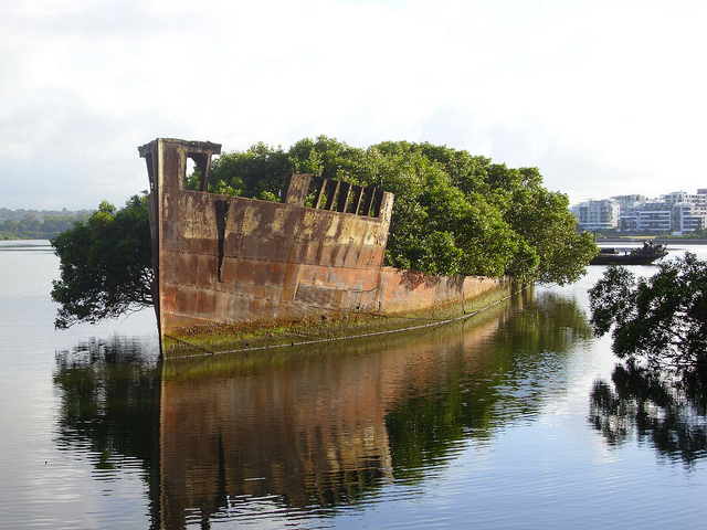 但是生命就是這麼奇妙,越是惡劣的環境,越看得見生命的韌性,建造於 1911 年的 SS Ayrfield,原本是艘運煤船,在二次大戰期間改為運輸船,1972年時被拖來 Homebush Bay,本該就這麼樣繼續「等死」的廢船,卻不知道從什麼時候開始,從船底卻長出植物,甚至越長越茂密,隨時間一點一滴,幾十年過去之後,成為當地人口中的漂浮森林。