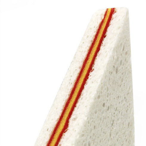 早餐吃三明治是個簡單又方便的選擇,基本的火腿與荷包蛋加上小黃瓜內餡,組合在一起就是美味,隨手拿了就結帳,也是趕時間的通勤上班族最愛!而現在則有設計師調皮地將廚房洗滌餐具的菜瓜布做了一些小小的改變,偽裝成美味營養的火腿三明治!切邊的白色土司上還有著氣孔,中間夾著火腿與起司;在沒有被告知的情況下看到這個畫面,應該沒有人會懷疑它是三明治的身分吧XD