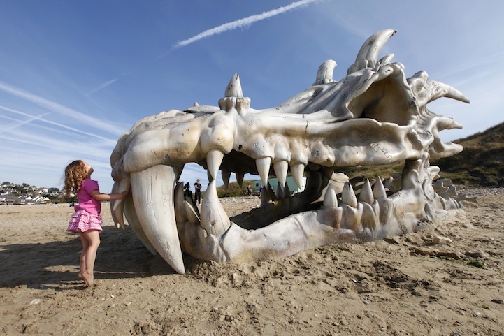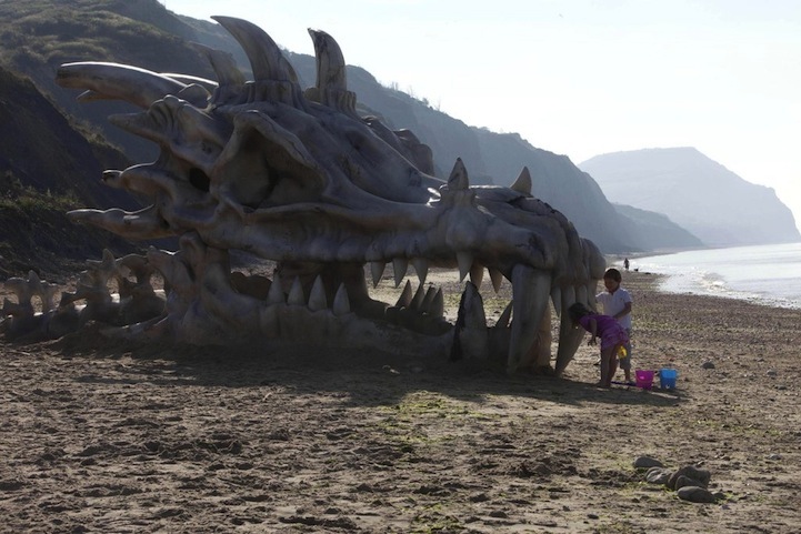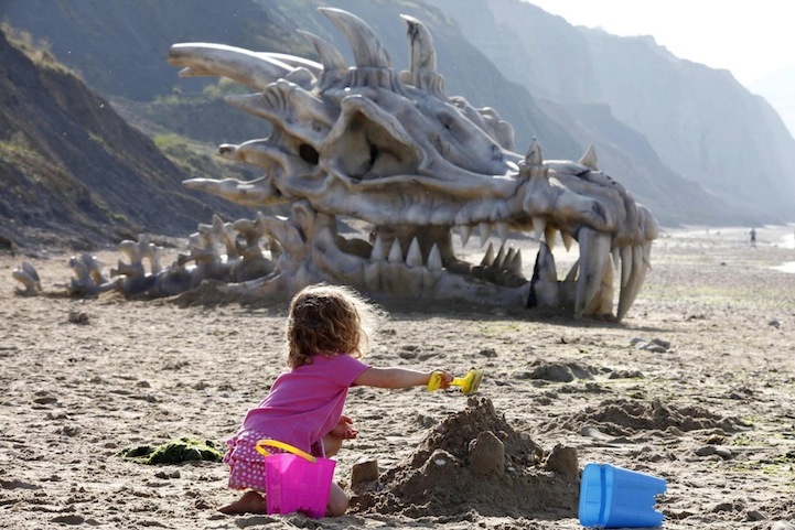 好啦!真的有點冷!不過電視和影片線上觀賞平台Blinbox希望能吸引的是收視潮,他們找來了三個雕刻師,花了兩個月的時間,設計出40呎高、8呎寬的龍頭骨模型,放置於英國Charmouth沙灘,不為別的,就是為了幫影集冰與火之歌:權力遊戲(Game of Thrones)第三季造勢,而這個宣傳手法的靈感,正是來自於劇中人物 Arya Stark 在君臨(King’s Landing)地牢中發現龍的頭骨的劇情。