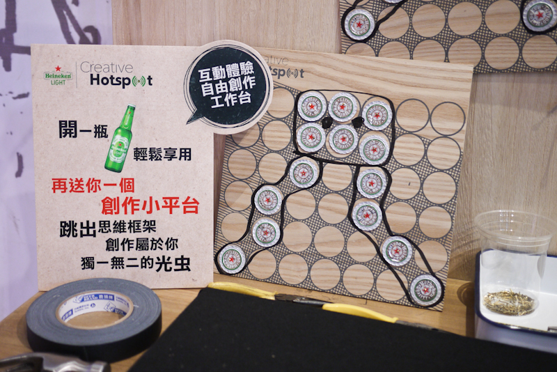 除了沉浸在前衛藝術家們打造出來的創意能量氛圍之外,《Heineken LIGHT Creative Hotspot創意熱點》也有個相當特別的互動體驗工作臺,只要拿喝完的 Heineken LIGHT 瓶蓋就可以玩 DIY 拼拼樂,當場驗收一下被 Heineken LIGHT+藝術聖光雙重洗禮後的成果XD 釘完的板子還可以帶回家做紀念喲!