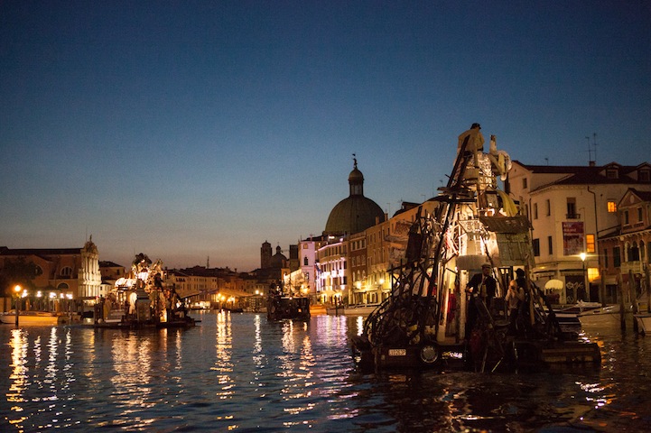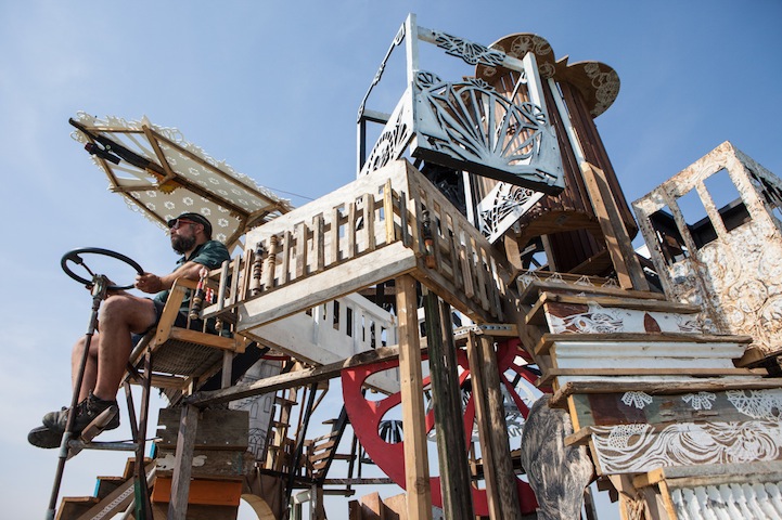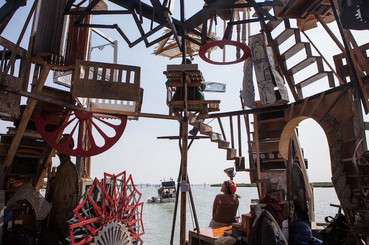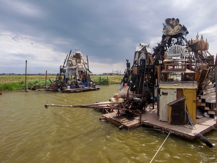 缺了一角的陽傘、油漆斑斕的木頭、舊式方向盤,藝術家總是勇於搞怪冒險,一群藝術家用各種不知道從哪撿來的破爛搭造方型木筏,還自組成船隊就這樣"逛大河"了,這時不免佩服外國人單純又豁達的性情,畢竟以這樣"簡樸"的裝備出海,真的是一場冒險無誤阿!