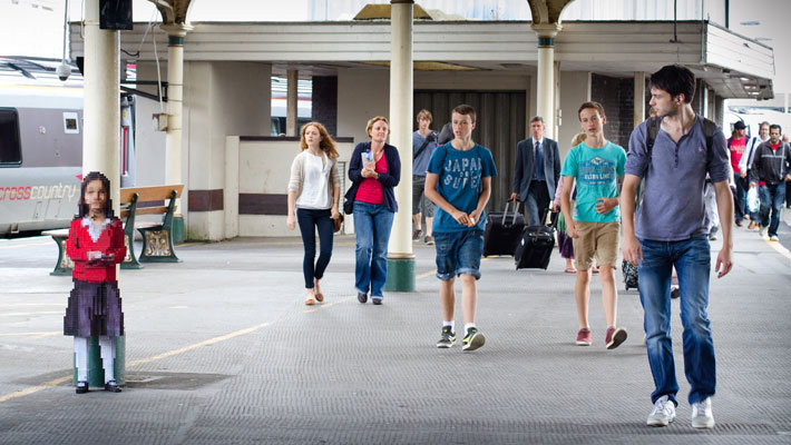 火車月台是個充滿故事的地方,不管是溫馨熱淚的接送情,或者是另一種「不要問很可怕」的故事。雕刻家 Luke Jerram 在英國 Bristol Temple Meads 火車站裡放了他的最新力作「Maya」,本來應該是個穿著紅衣的可愛女孩雕像,但是像素化後的女孩輪廓相當模糊不清,讓人頻頻眼花自己到底有沒有看走眼,若是再配上夜間昏黃的燈光,難保不會有旅客被嚇到啊!