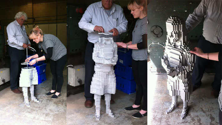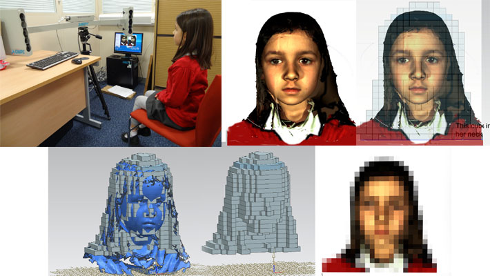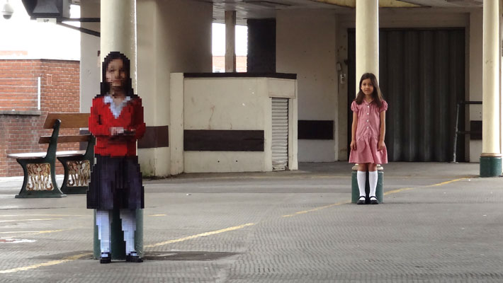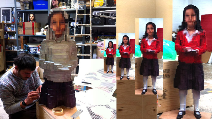 Maya 的原始範本正是 Luke Jerram 自己的女兒,他用 Xbox Kinect 掃描女兒的樣子,再透過軟體計算後,將影像輸出成一張張方形貼紙,待底殼組裝完成後再貼上去,遠遠看來就跟普通女孩幾乎無異(如果你剛好近視的話,就更看不出差別了),直到近看才會發現這個女孩好像有哪裡怪怪的(驚)....