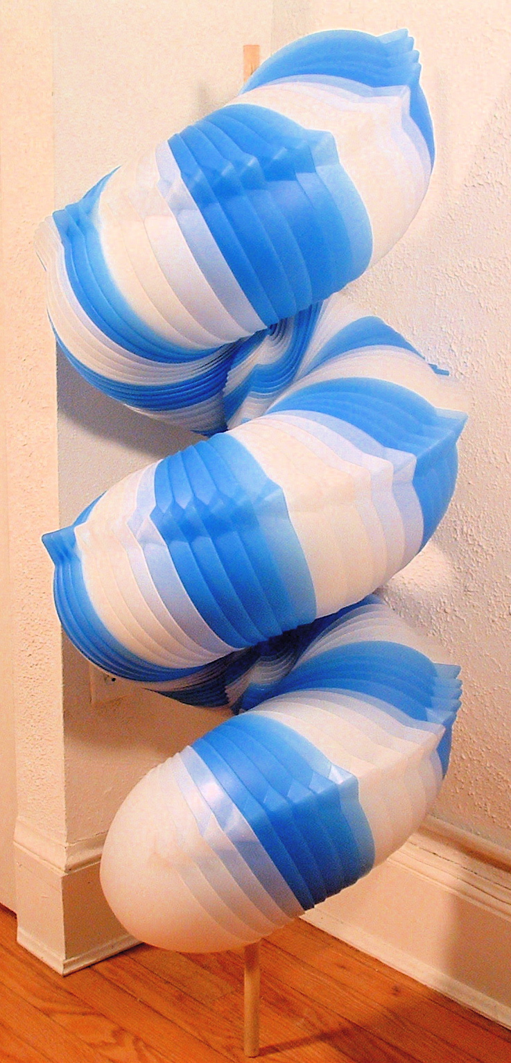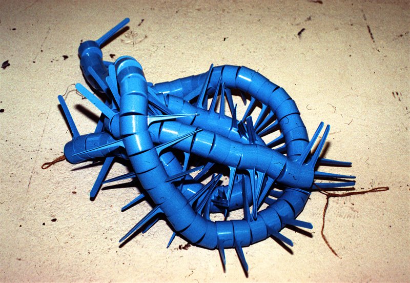 我們都知道創意來自於生活,例如衛生紙捲可以變成浪漫的花飾、絲瓜絡經過設計變成日系禪風家具,但似乎還是得有雙巧手才能打造這些作品,而藝術家 Edmond van der Bijl 選擇以數量來決勝負,用大量重複的單品營造出完全不同的形象,仔細看上圖的藍色星星雕塑,恬靜的藍色和多角星星相當具有節慶氣氛,但其實它是由一堆超普通的塑膠三角衣架組成的,想不到它的真面目這麼居家,看得我好想也在家組一個阿!