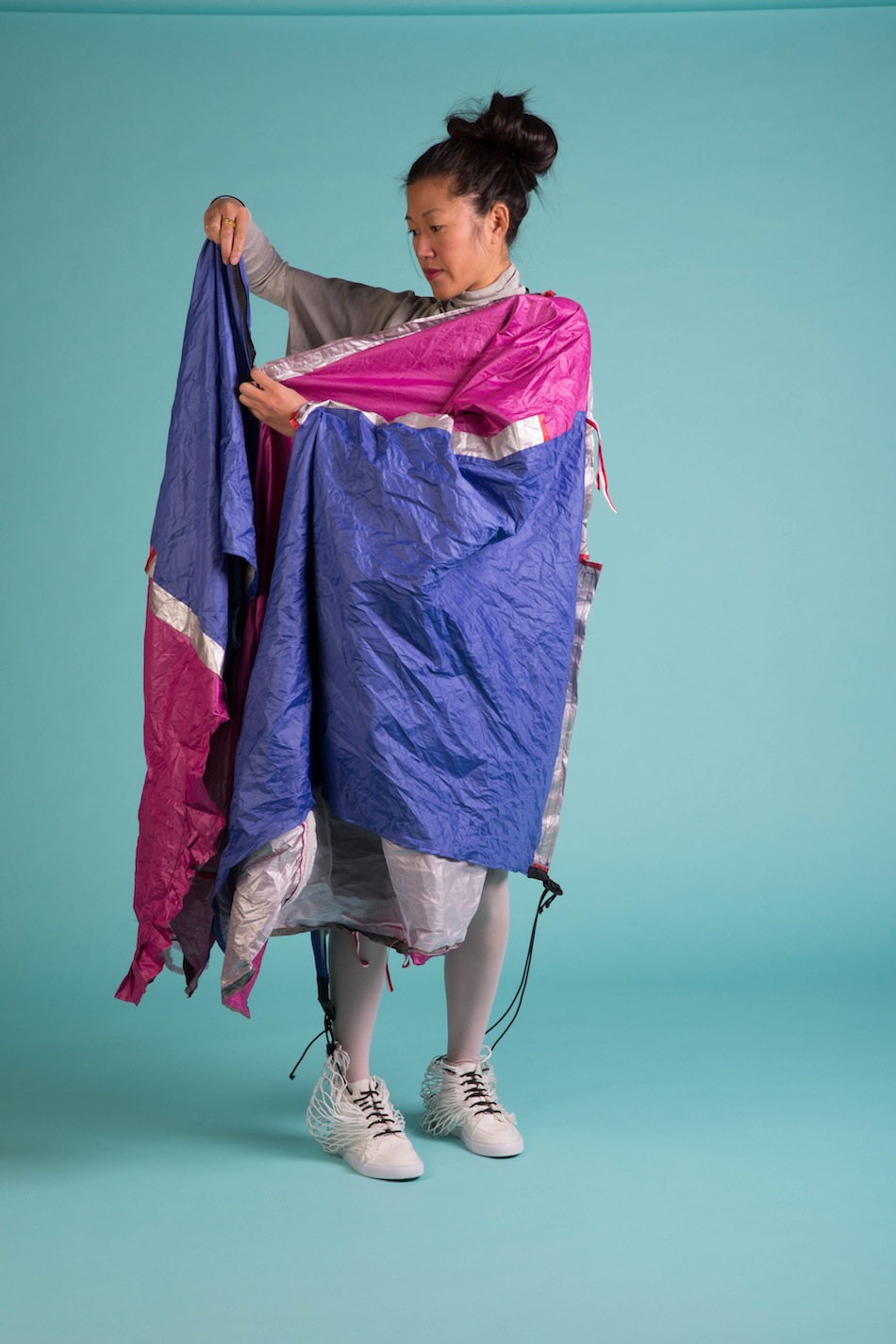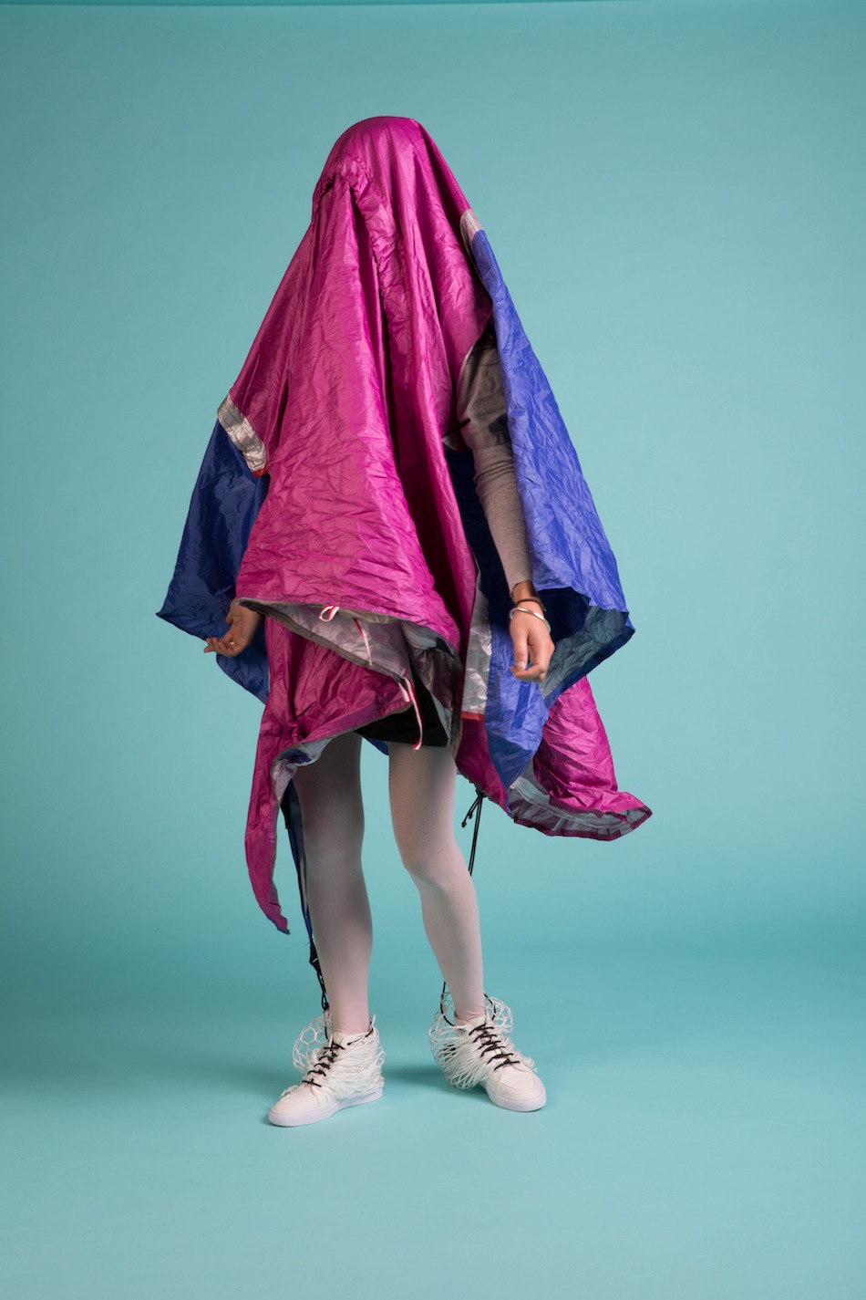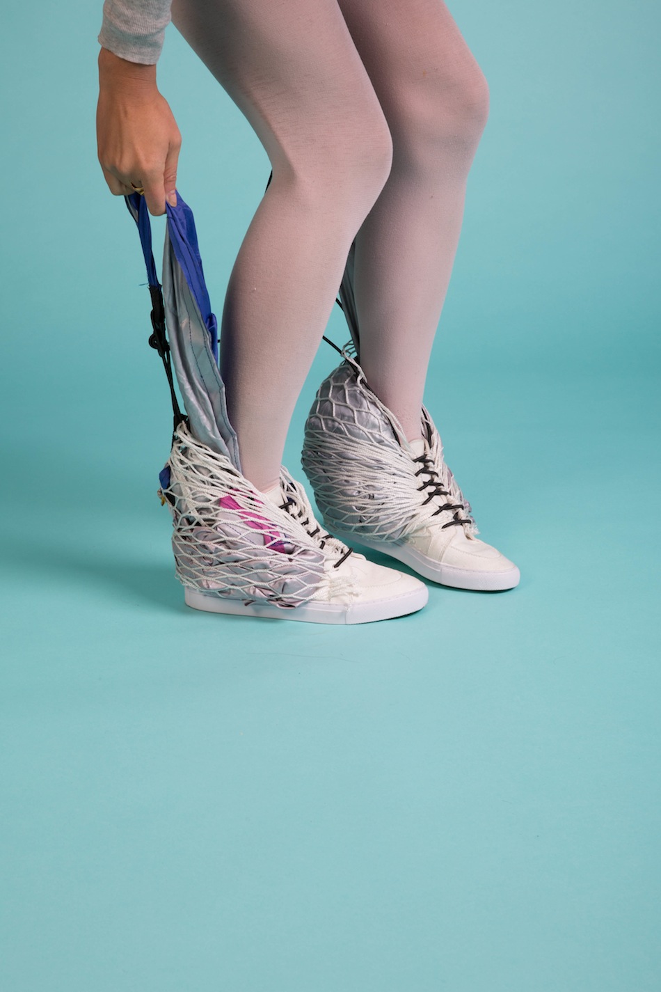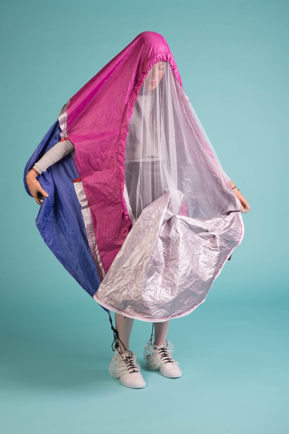 看似很OK的普通球鞋,鞋跟處卻多一包不明物體,看起來有些突兀不說,拉開後居然是兩大塊像雨衣的尼龍布,目的則是為了提供即時方便快速的個人輕便帳篷,究竟怎樣的人會有這種需求呢!(不解)