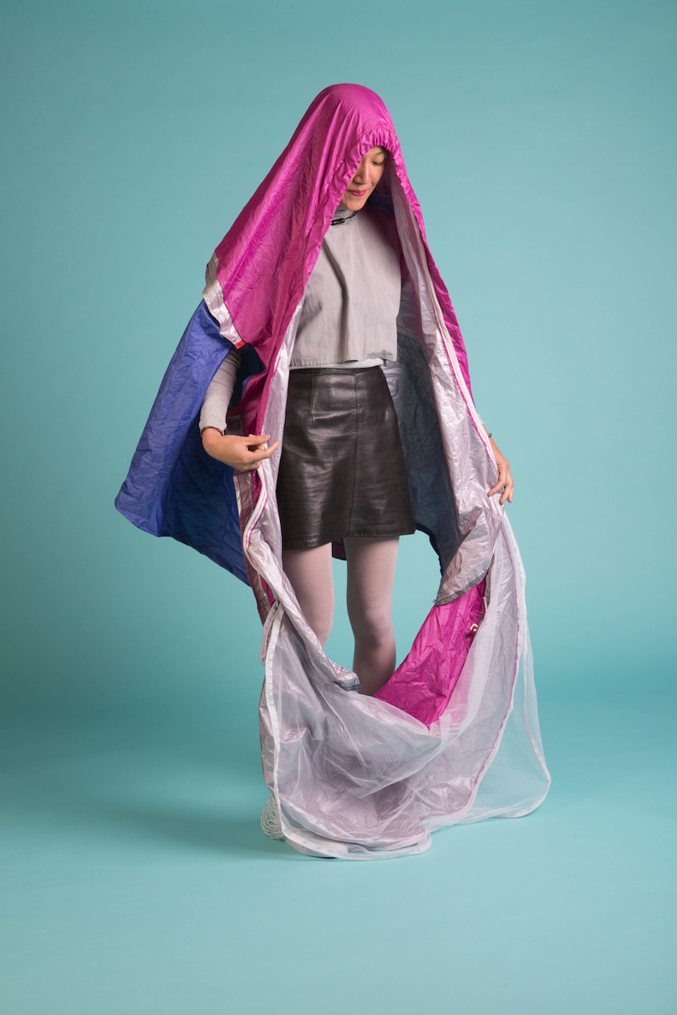 喔!組裝完後好像挺有這麼一回事的,雖然這個帳篷毫無支撐性,只能很無力地貼在人身上,萬一遇到流汗可能還會難受到想直接棄鞋奔逃,但是它的方便度還是讓人期待這產品未來的發展性。