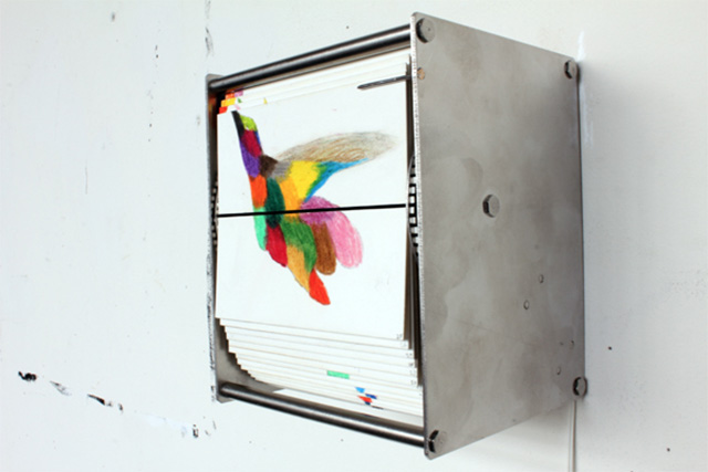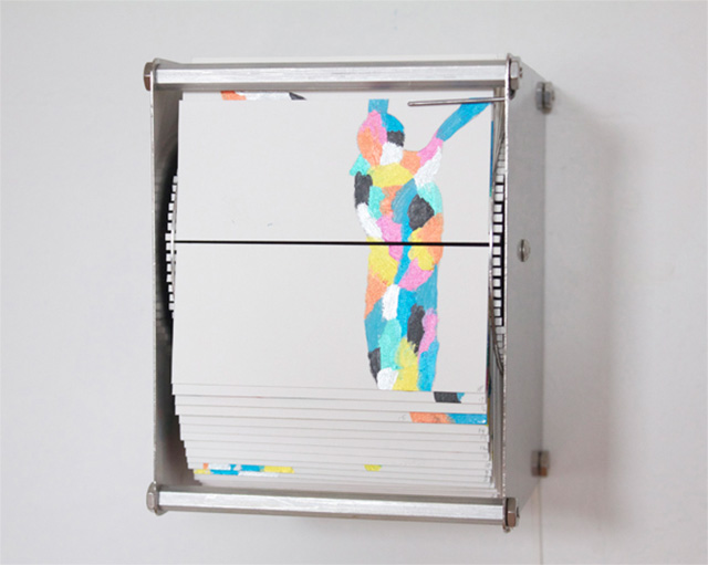 這陣子應該有不少人買了「大人的科學」的《電波時計》翻頁鐘,即使翻頁時發出的"啪搭"聲令人又愛又恨,不過整體散發的復古情調還是讓人願意暫時無視這些聲音。本來顯得有點過於高調宣示自身存在感的啪搭翻頁聲,如果換成用來呈現藝術品或許就剛剛好了!畢業於 Royal College of Art 的 Juan Fontanive 在頁片上用壓克力顏料配上拼貼製作翻頁動畫,這時就會覺得,機械翻頁時所發出的聲響還真是清脆悅耳哪!