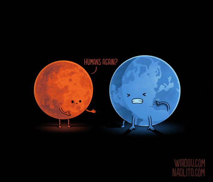 地球覺得很癢、忍不住抬腳抓抓,一旁的火星關心問「又是人類在搞怪嗎」