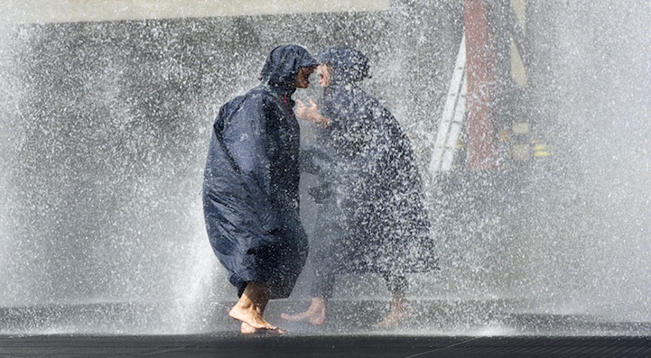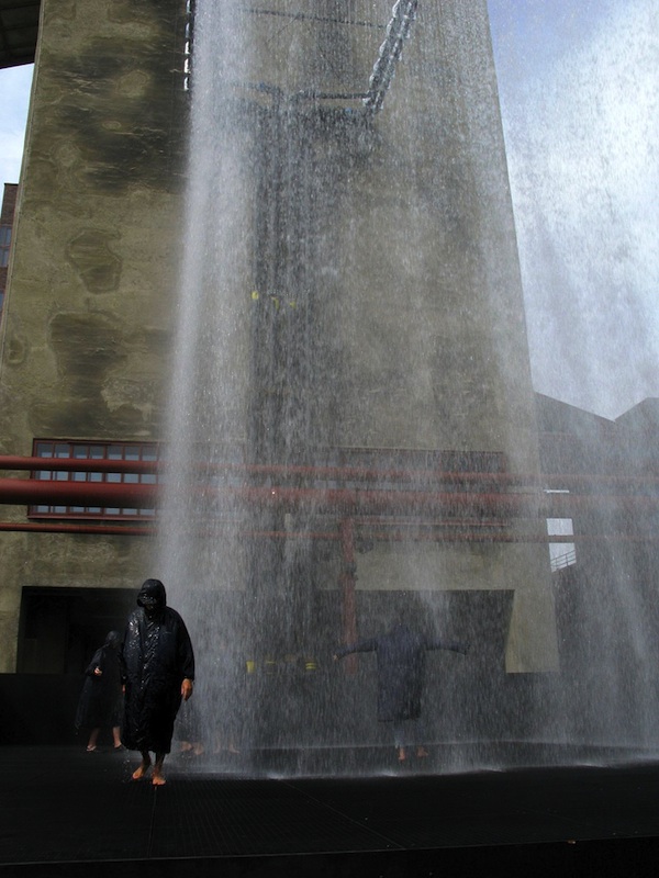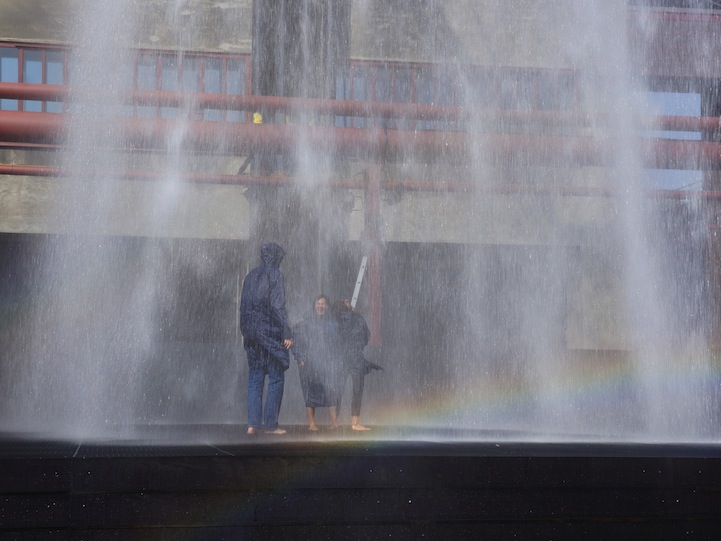 約莫一年前英國的 rAndom International 團隊以雨為主題打造了互動式裝置 Rain Room,透過感應裝置,偵測到人經過時就會暫停降水,但是這次卻不來這套了,直接讓水從約四~五層樓高的地方傾洩而下,出水處可清楚看見水柱的形狀,經過一段高度後水柱便發散成水霧籠罩著地面,有時甚至能隱約看到彩虹出現在其中,相當歡樂而壯觀!