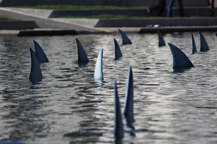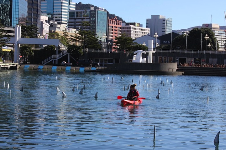由 Green Peace 組織在紐西蘭推動的一項關心鯊魚的活動,據資料顯示,由於每年約有七千萬隻鯊魚因為被切掉背鰭而無法繼續在海中生活導致死亡,世界上已有許多國家明令禁止魚翅擁有買賣,但是在紐西蘭仍為合法,於是 Green Peace 組織手工打造了100個假背鰭,其中 99 個是普通的灰色,代表禁止魚翅的 99 個國家,而唯一一個橘色則代表紐西蘭,希望人們看到時可以重視這個議題。