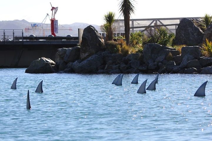 約在上禮拜13號星期五,紐西蘭的 Aotea 淺湖面上出現了 100 個鯊魚背鰭裝飾藝術,看著它們在那邊漂阿漂的,看起來似乎有點惡搞,還以為是類似黃色小鴨那樣的藝術活動,但其實背後卻有更深一層的涵意在....