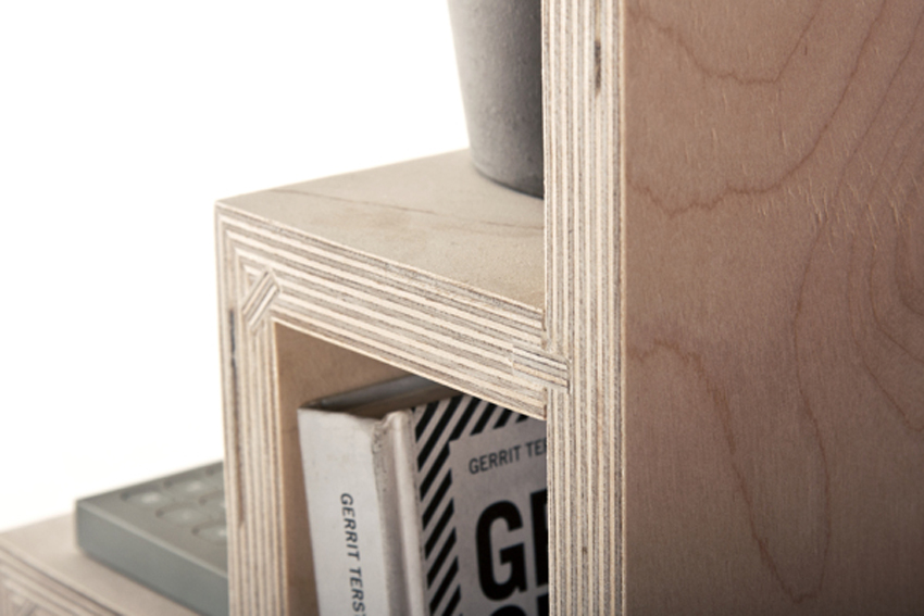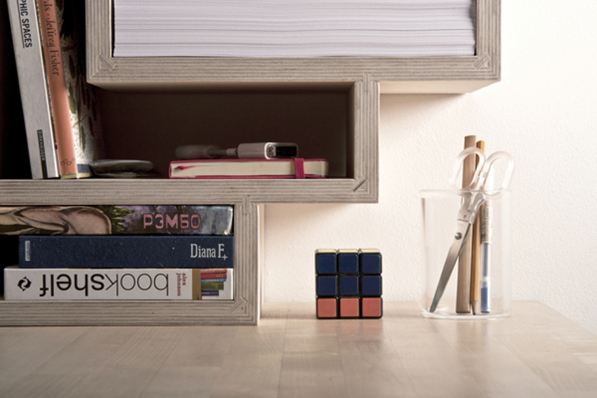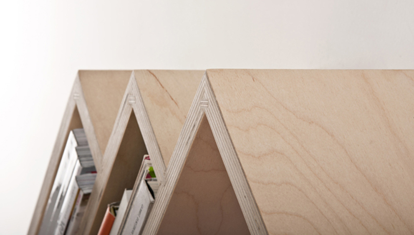 Drap Shelf 以夾板細木作構成,有在玩木工的屋主也可以嘗試自己動手做,不過看起來簡單的幾何造型,在角度和重心分配的拿捏可要特別注意,擺上書本後才不會重心不穩頻頻跌倒,同時在木櫃轉角處,也特別加上水平木榫提供更強的支撐力。除了書桌邊櫃之外,Drap Shelf 因為擁有直角外型,也很適合放在樓梯邊或作為樓梯下方的收納櫃,凸出的柱子也不再是收納死角,不浪費一絲空間。鋸齒狀的邊緣,將兩組以上的 Drap Shelf 也能像玩俄羅斯方塊一樣組合成整面收納櫃,沒想到光是利用幾何線條,簡單的收納櫃也能有這麼多種變化吧!