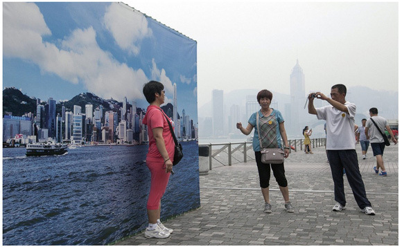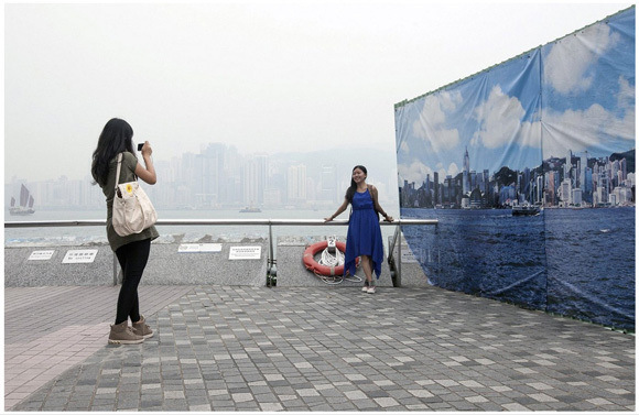 香港當局或許是預見這種情況,事先在港灣旁搭建一組臨時帷幕,惟幕上印著的照片,是藍天碧海下的港邊美景。遊客們紛紛選擇站在這個「假背景」前拍照,好似香港的天空是清澈的藍色,所有景色都能在港邊一覽無遺。