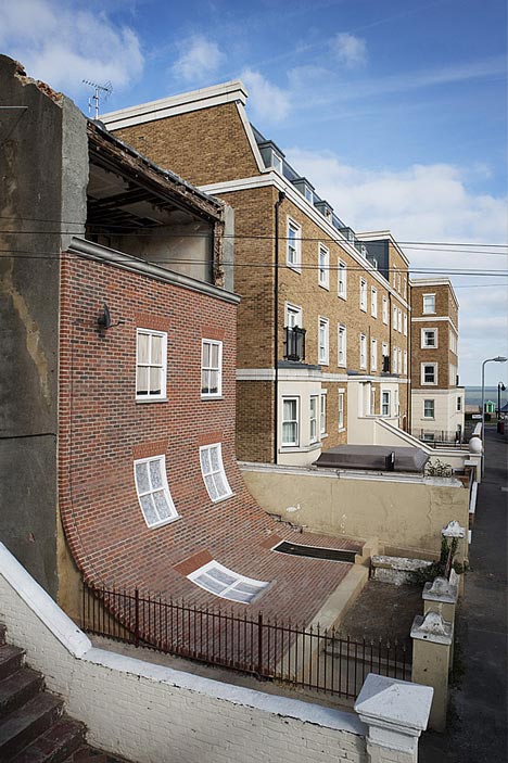 住在台灣的人都知道,海邊的房屋容易因為海風侵蝕加速耗損,不過像這樣整面牆軟軟的攤下來又是哪招阿!英國一個靠海小鎮 Margate 的社區出現這副奇景,紅磚公寓的外牆整片滑落斜攤在庭院裡,表面磚瓦都沒剝落,彷彿這片牆最初設計就是像壁紙一樣用貼的貼在建築物上,到底該說海風的威力太驚人,還是英國建商太黑心呢!