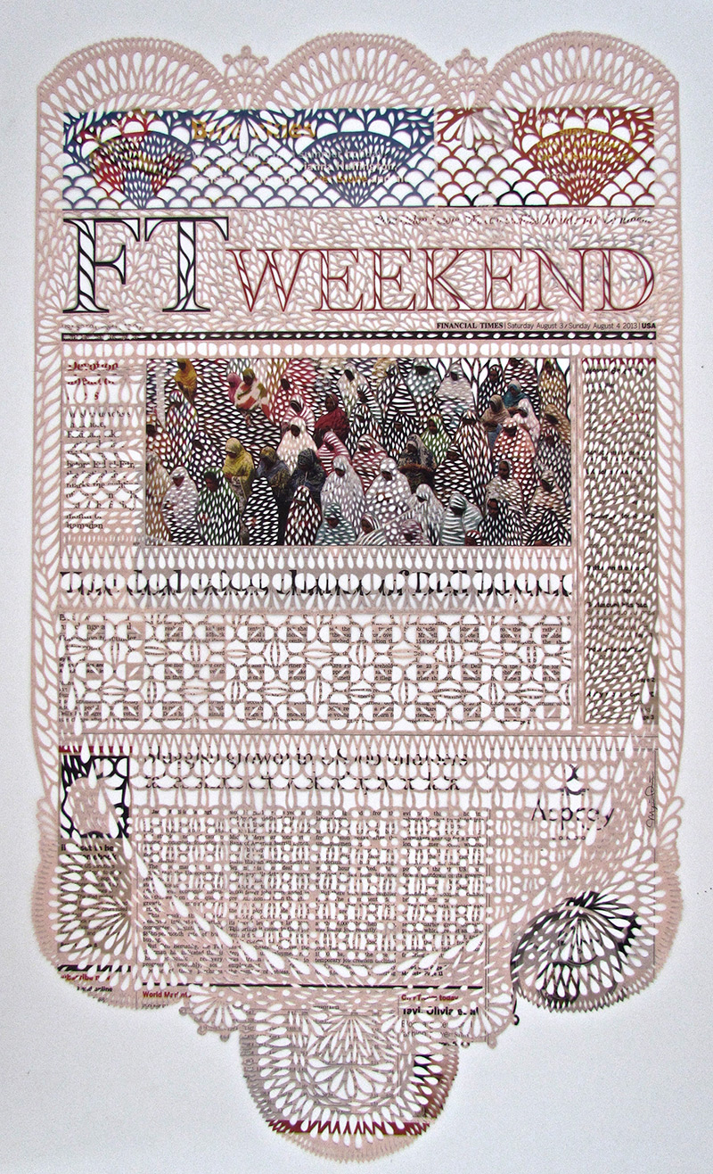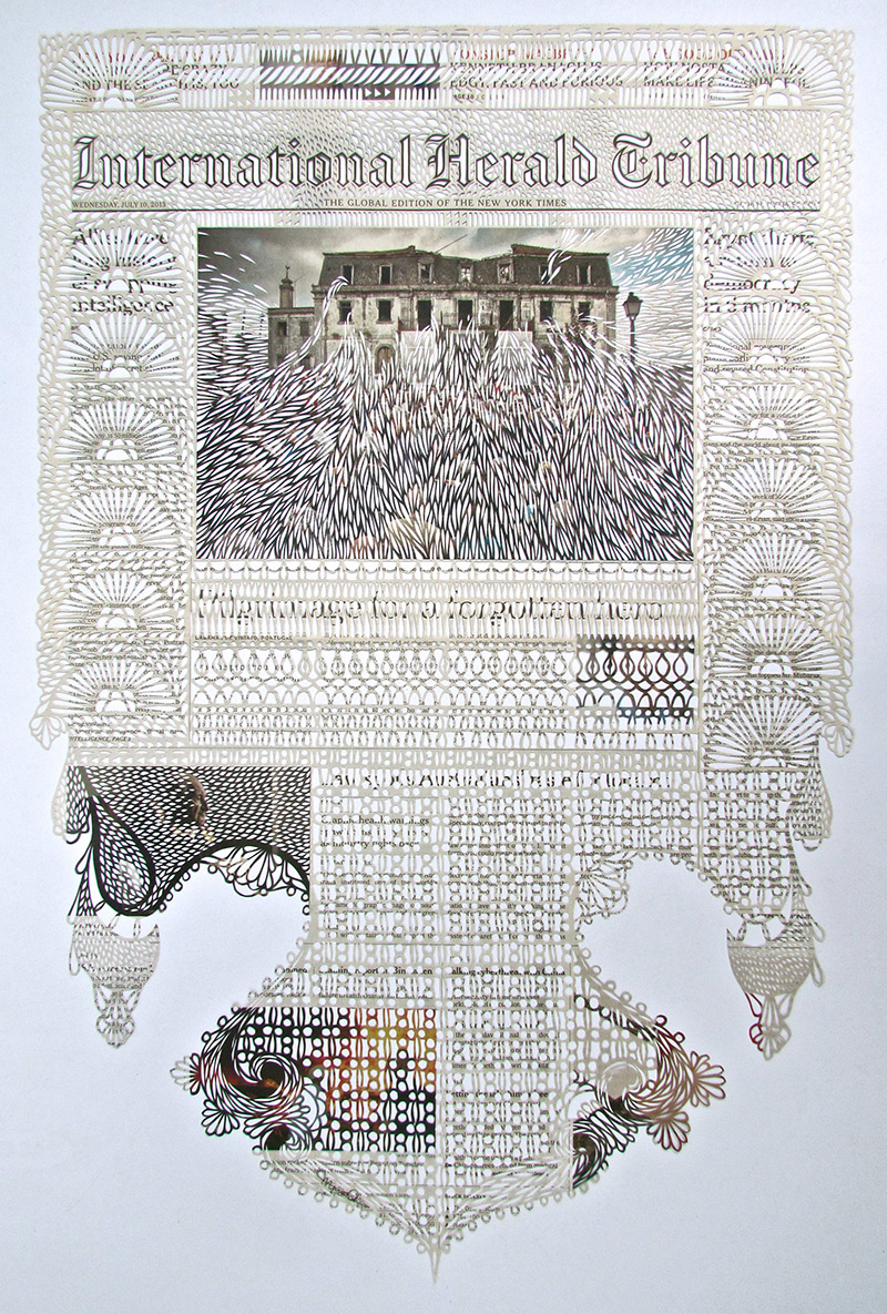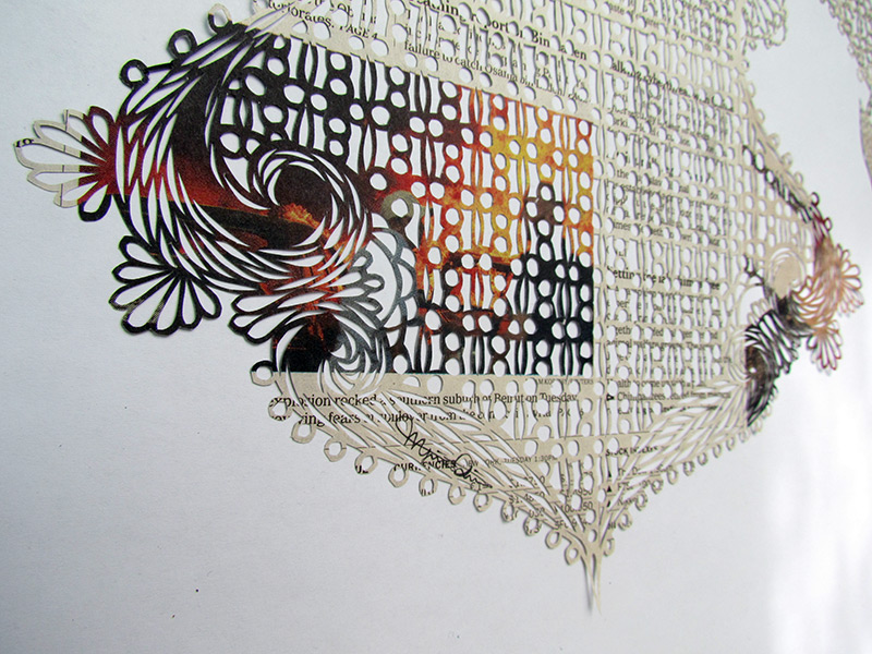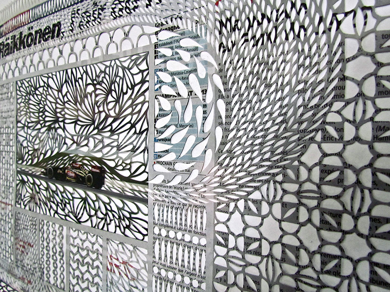 昨天的報紙除了用來墊便當、包垃圾之外,還可以拿來做甚麼呢?加拿大藝術家 Myriam Dion 以手工雕刻方式將報紙變成一大張刺繡蕾絲,細密的花紋和精雕的圖騰輪廓,看起來就像布市裡販售的美麗蕾絲,完全想不到這原本是報紙來著,讓人不得不佩服 Myriam Dion 的手藝和毅力阿!