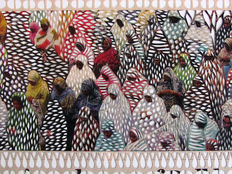 除了大大小小的格子紋路之外,報紙上原本的彩色圖片有時也會成為作品主題,有些是宗教團體,有的則是騎馬奔騰的照片,剔除報導文字的框架後統統成為藝術作品,呈現了最單純的美感。