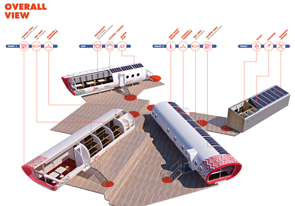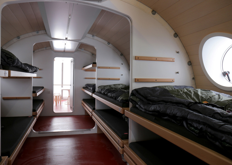 LEAPrus 3912 是由四個管狀空間組成,其中兩個館是睡覺的房間以及簡單的交誼空間,讓房客們可以彼此交換人生歷險的心得,第三個館是餐廳、第四個比較小的館則是洗澡和廁所的地方。