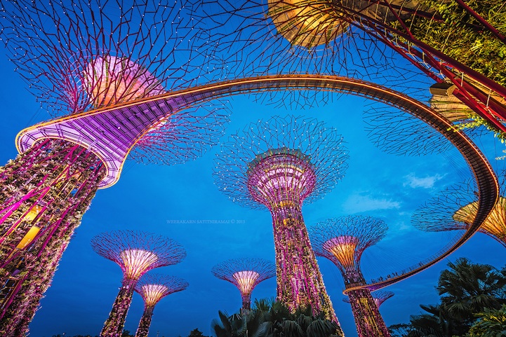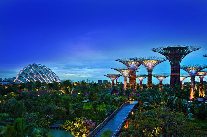 這些在夜空中散發出璀璨光芒的樹,莫非是什麼科幻片的電影場景?!其實這是新加坡濱海灣公園的Supertrees,濱海灣公園位於新加坡濱海灣,從2006年構思到2012年完工,總共耗時約六年的時間,是新加坡花了10億美元填海造園的代表作。