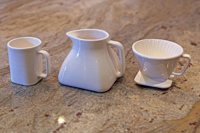 陶瓷是相當適合用來煮咖啡的器具材質,於是設計師也弄了個加價購的陶瓷杯具,專為《Invergo》設計的尺寸,有單人杯、多人壺和濾杯。