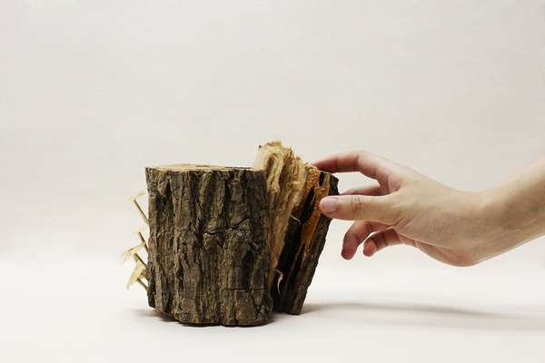 短短一截樹幹,旁邊還長了點小蘑菇,乍看還以為是單純的居家裝飾,但裡頭其實藏有小祕密在!中國藝術家 Pochiko HO 將樹幹從中剖開,取下來的一截改造成小小書冊,塞回樹幹後從外觀幾乎看不出破綻,相當古意精緻的造型,讓人完全捨不得拿來用阿!