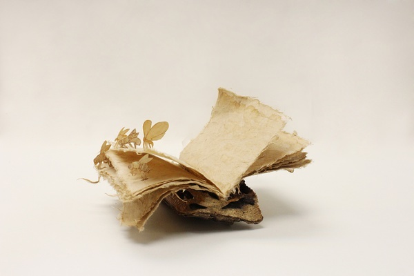 Pochiko HO 擅長各種手作紙品,風格相當小巧溫馨,這個樹幹創作有趣的地方不只在藏東西的應用,Pochiko HO 還在其他地方增添一些巧思,例如樹幹邊緣有幾株用紙做的小小蘑菇,截下來的木頭則當作隱藏式書脊,加裝幾片粗糙的纖維紙,抽出來的小紙冊上還有一些皮影戲風格的昆蟲紙雕,把各種天然的元素組合成隱藏式書匣,古樸的感覺非常適合用來藏點武功秘笈啊!