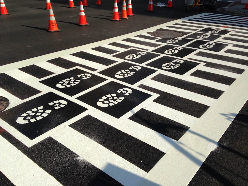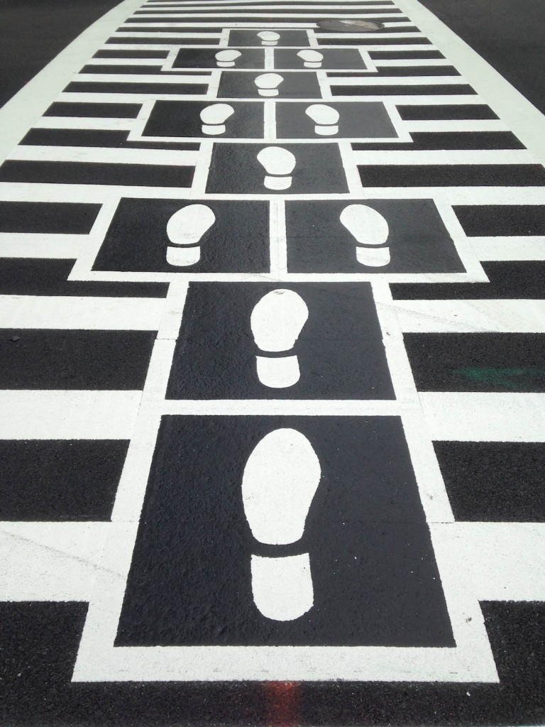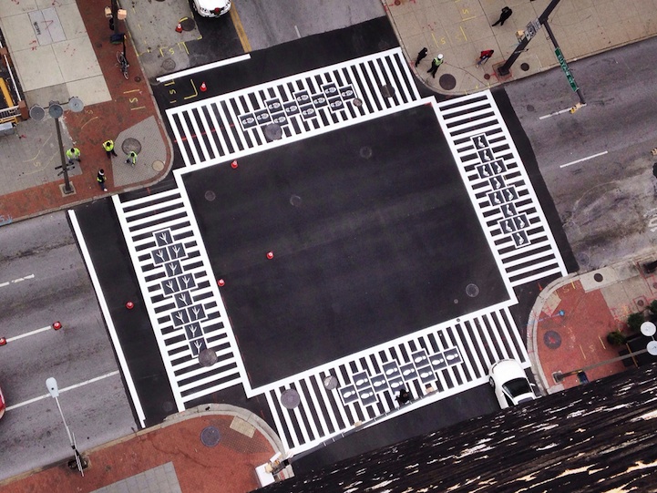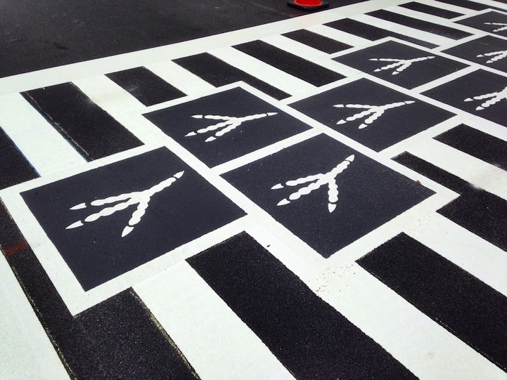 你還記得跳房子該怎麼畫嗎?藝術家 Graham Coreil-Allen 美國巴爾的摩的十字路口上做了個有趣的藝術企劃,把跳房子塗鴉融入斑馬線中,並在格子裡壓了可愛的腳印們,除了把兒童時期的樂趣帶到都市馬路上之外,不同的前進方向還有不同含意的腳印圖案,讓人們在低頭疾行的過程中,能稍加停下思緒更了解這個地區的歷史風貌。