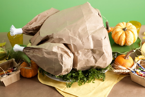 要製作如此特別的感恩節大餐,你所需要的材料是一個大的牛皮紙袋,兩個小紙袋,再加上一些紙做為裝飾,還有爆米花來將烤雞塞得飽滿。經過簡單的組合,便可以快速地得到桌面上的一盤美味烤雞了!不過除此之外,你可能還是要另外準備主餐才行啊。