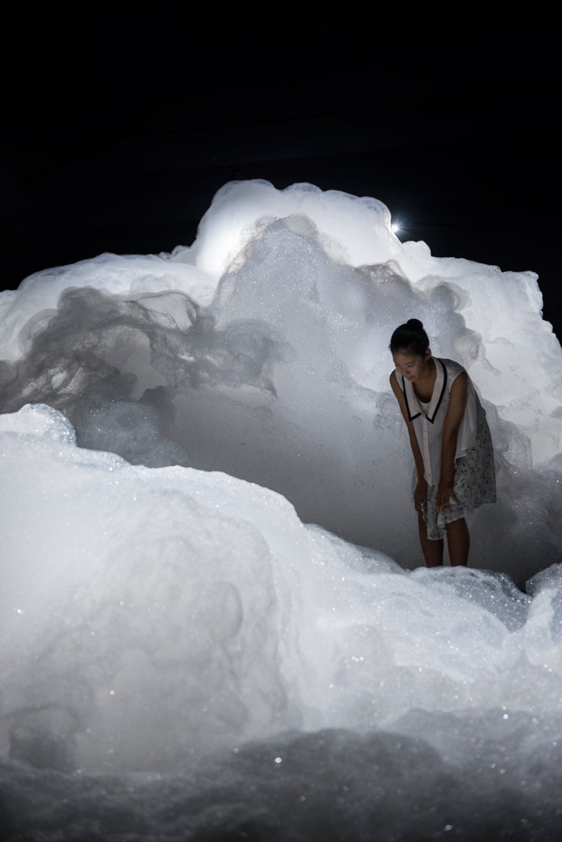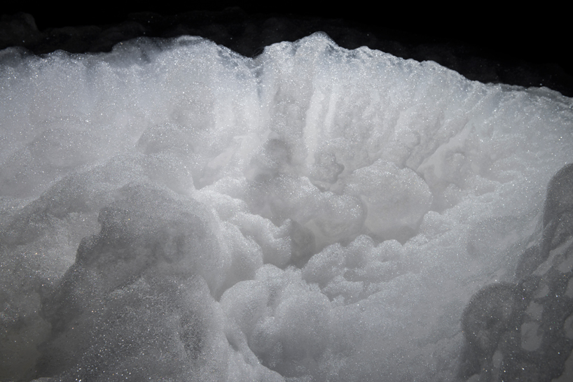 電影常演出對家事苦手的人因為倒太多洗衣精而冒出太多肥皂泡泡的場景,在現實生活中可能會清得很痛苦,但如果把格局整個做大,故意讓泡泡們蔓延到整個房間地板,會不會其實是很壯觀的呢?日本藝術家 kohei nawa 用泡泡堆疊出滿屋的奇幻美景,黑色房間與白色泡泡交織出寧靜的氣氛,脆弱的泡泡讓人走在其中大氣都不敢喘一口,就怕破壞這夢境一般的景色。