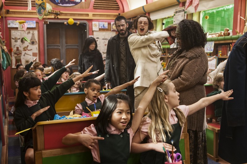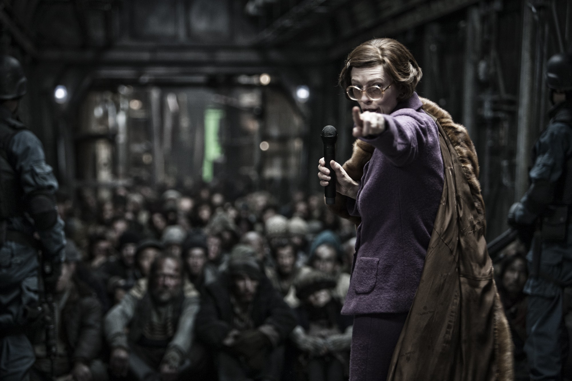 《末日列車》以底層人民的武裝革命為外衣,但整部電影真正要探討的題目還是太大了,既要忙著把人類文明演化的縮影代入從尾端車廂往前層層推進的景觀:從暗無天日的「穴居」處出發,殺去下一節車廂重見光明,傳遞著「火把」並聯合抵禦外侮,再經過植栽培育室意味進入「耕作生產」,到了幼兒教室代表繁衍後代、鞏固「家庭」觀念,並以「教育」控制思想,女老師以護育者的形象粉飾實質上是迫害者的身分,再豢養出一群腐敗的「上流階層」,然後就在抵達駕駛室前,進入一節「世紀末」的糜爛狂歡車廂;又要在水落石出之際表達「下層的革命其實是上層的陰謀」這個與《駭客任務》太相似的設定。片長進行到一半時,已經建立起的動作調性被從中切割,正式進入荒誕奇觀式的哲學領域,使得電影本身和那台列車一樣,前、後半段是兩碼子事,然而如同奉俊昊的慣常風格,這當然是刻意從中作的梗。