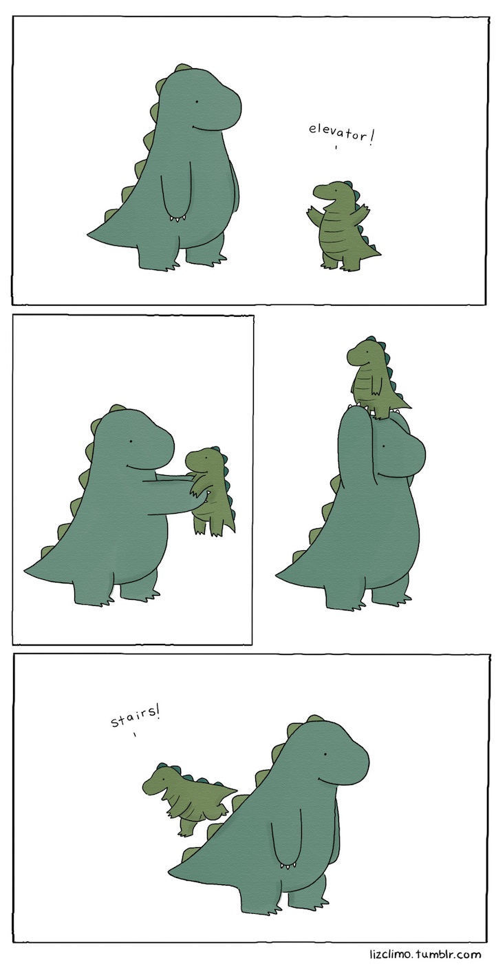 Liz Climo 白天是美國知名卡通辛普森家族的動畫師,下班回家後則是她的插畫時光,據說她曾對自己的畫風感到很害羞,總覺得拿不上檯面、無法和其他很厲害的插畫家相比,「但幸好我堅持下來了,真的,擁有個人風格才是最重要的」,她的創作靈感很多都是來自工作時遇到的有趣人事物,或許你在其他地方也看過她的作品,如果你也喜歡她,不妨到 Tumbler 或 Facebook 去追新進度喔!