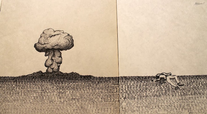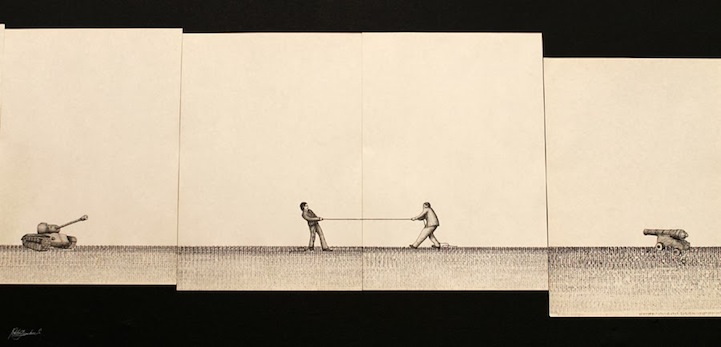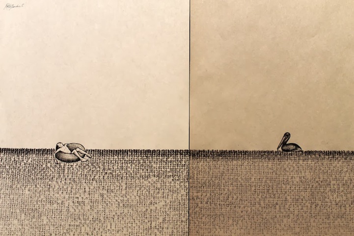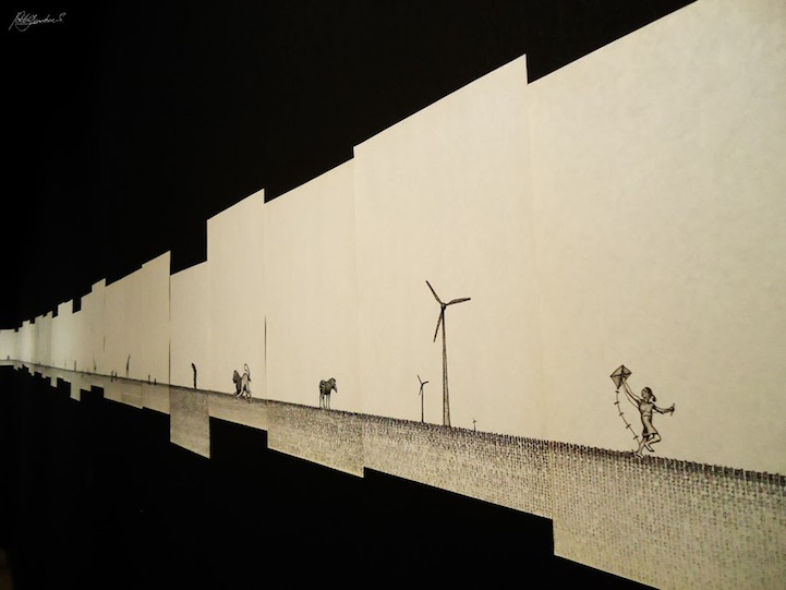 看到鍵盤上半部的「QWERTY」你會有甚麼想法呢?藝術家 Pablo Gamboa Santos 覺得它們的排列方式很像一道水平面,於是想到將字體轉化成圖像,順勢衍生一份長達 300 張的手繪圖稿,每張圖的內容都有連串性,全部排起來就像一個長篇故事集、可以繞滿整圈房間!