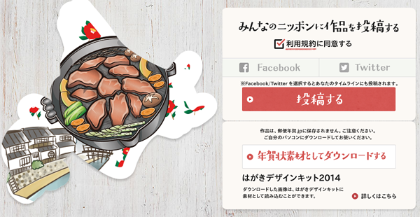 完成的作品可以下載到電腦或上傳到臉書或者推特,有興趣的人可以到 郵便年賀.jp 網站去玩玩,感受一下日式的新年氣氛喔