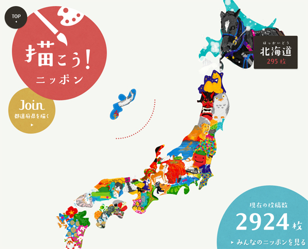 點入網頁可以看到來自各地的手繪作品,並依照每個縣來分類,將游標移到該區就會反轉顯示數量,而在網頁右下角則有總投稿數。