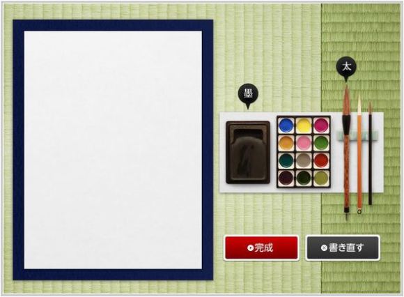 堅持傳統的人應該還是比較喜歡手寫在紙上,最好還要使用毛筆書寫才能顯示出誠意,身為郵務工作的郵便局當然也懂這種情感,所以提供的數位畫筆都是毛筆,有三種尺寸,再加上顏料選擇,手感好的人只要有這些工具就能輕輕鬆鬆畫出名家風範的賀卡,不過如果你是手拿滑鼠又不會畫畫的人,大概就只能畫出上圖這樣的作品了(苦笑)
