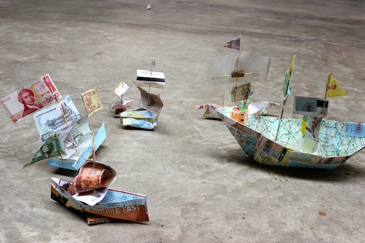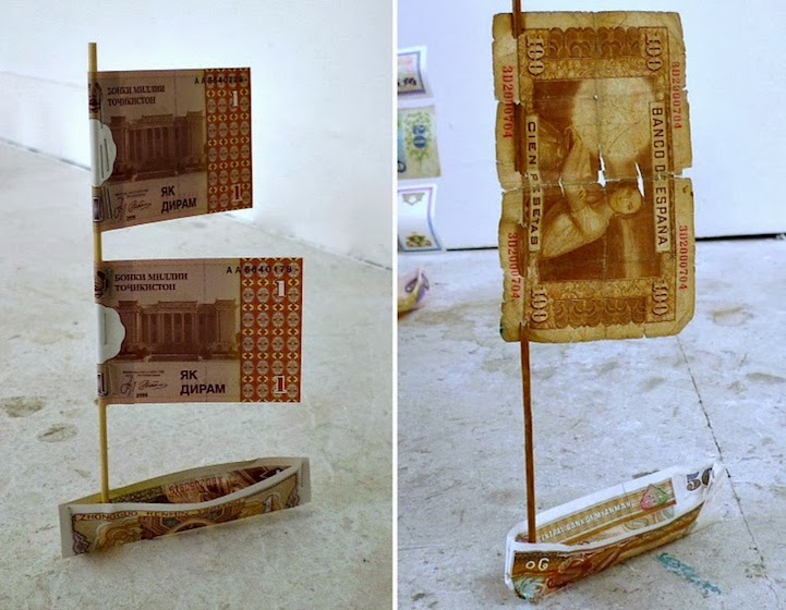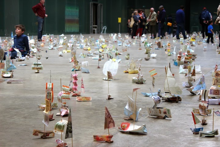 雖然這些小船沒有真的放進河中,不過光是這樣也很壯觀的了,藝術家Susan Stockwell把世界各國的鈔票折成小紙船,除了紙鈔之外,有些也改用票根或者地圖來代替,上百艘款型大小不一的小船們四散在地板上,參觀者不僅可以穿梭在其中,Susan Stockwell 甚至鼓勵人們也能捐出手邊的紙料來打造自己的小船,加入貨幣艦隊的行列!