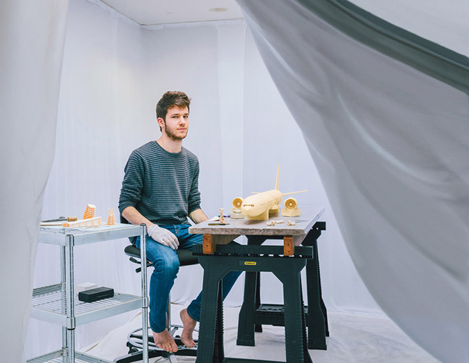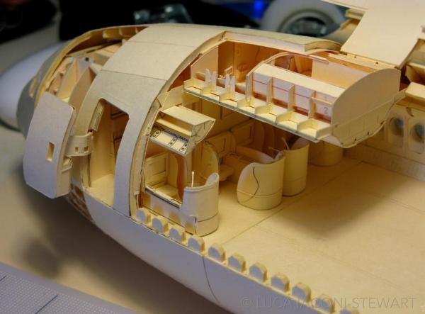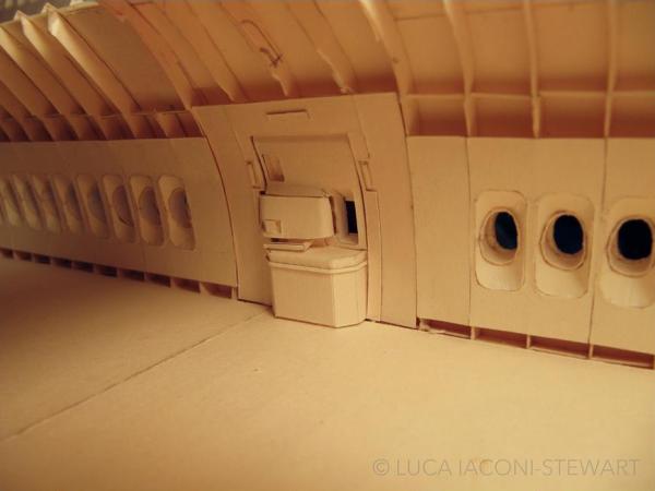 原本還是學生的 Luca Iaconi-Stewart 從五年前開始動手做飛機模型,先在 Adobe Illustrator 上整理出飛機各部位的版型,再轉到馬尼拉紙上,過程中最痛苦的部分自然就是組裝黏貼了,用小鑷子夾著紙片一個個拼湊成型,他算過時間,經濟艙的一張椅子平均得花掉20分鐘,經濟艙的座位甚至得要 4~6 個小時,到後來他為了更專心來完成這項作品甚至直接休學,,Luca Iaconi-Stewart 用五年青春完成這架純手工打造的飛機,雖然不確定他還願不願意再繼續做這種耗時耗力的創作,但至少他的人生絕對會因為這架飛機而有所不同!