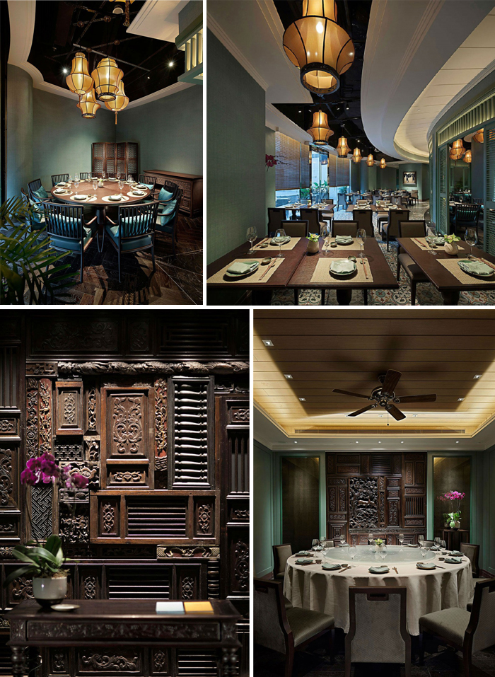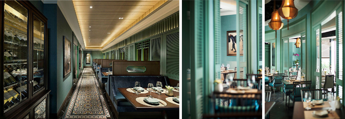 主打湖水綠色調的背景裡襯托出深木質感,一系列湖水藍的絨布長椅中性了空間的色調,從容優雅地等候他人入席,走著長廊上傳統圖案的瓷磚,補上周遭古董傢俱那古典氣息,越式絲質吊燈、東南亞色彩的吊扇、窗旁一排列百葉窗,柔細燈光瀰漫法式浪漫於越式空間,貴氣與愜意繚繞,三五好友把酒言歡,沉醉之刻或許最適合在這樣的空間裡。