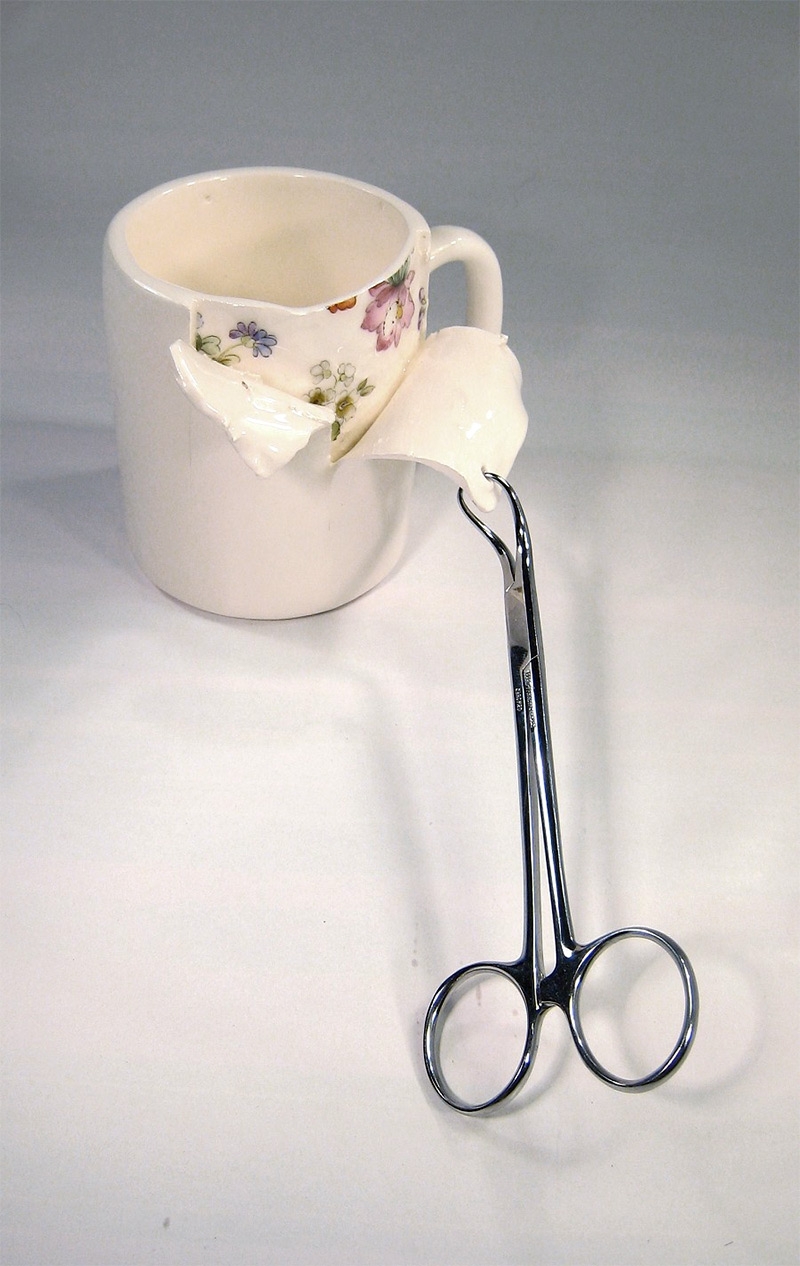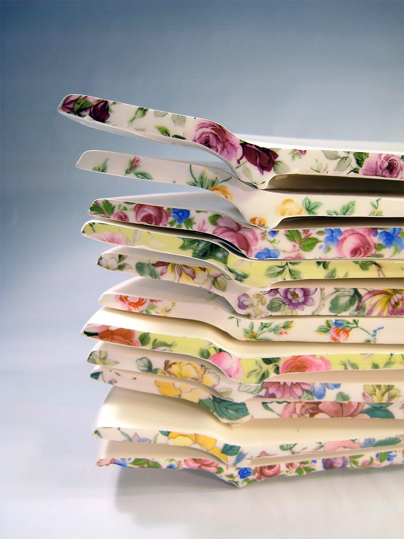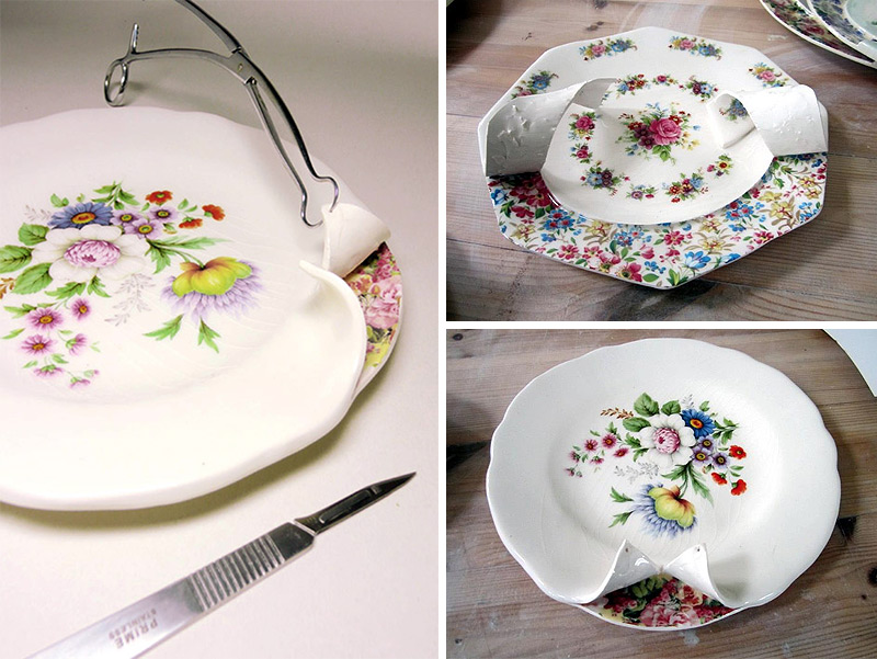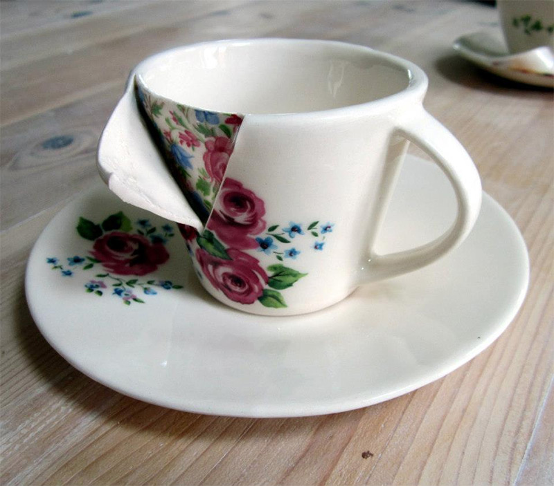 從杯緣和盤邊切開一角再慢慢撕開,Beccy Ridsdel 把硬梆梆的骨瓷餐具覆上柔軟材質的錯覺,仿彿再多掀開一些,就能真的得到一份全新的小碎花餐具,而且最有趣的地方是,從被掀開的一角內層能看到刻意處理過的斑駁表面,彷彿真的是被撕開的,情境模擬得相當週到呢!