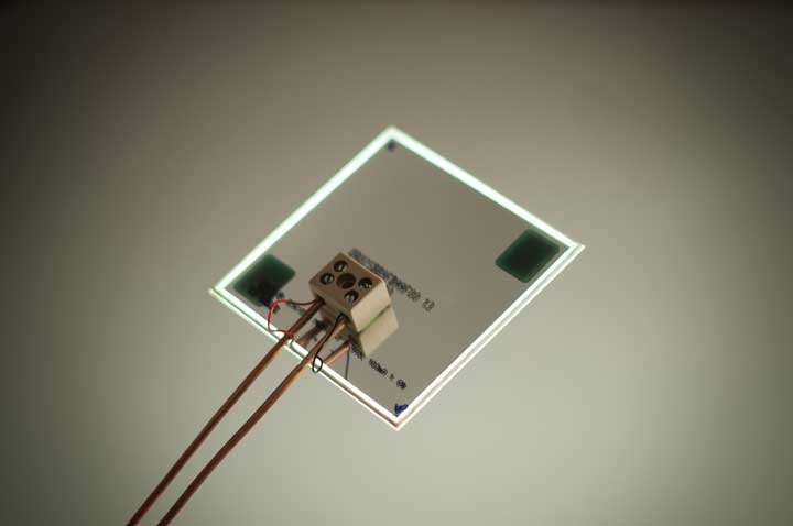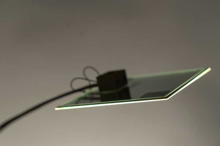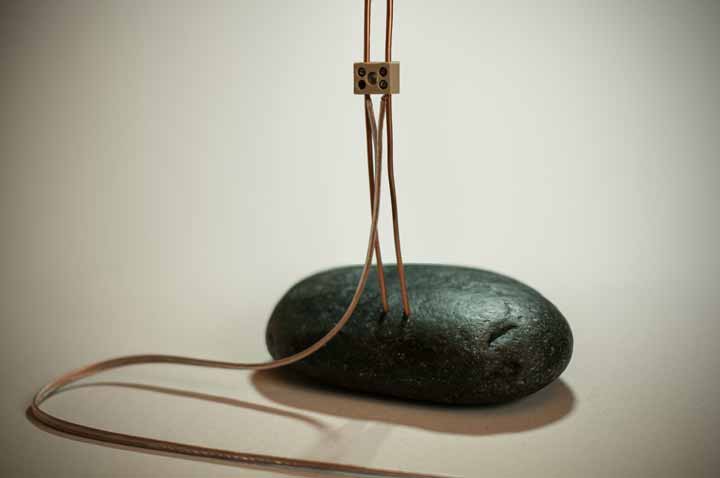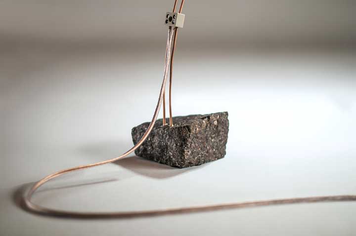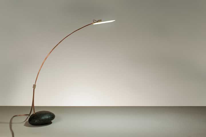 燈光來源是 OLED,發光效率高於 LED,兩條細細的燈臂是用 3mm 的銅線外塗聚合保護層,遠和很像兩支細竹子,底座則是天然石頭,Alessandro Marelli 挑選多種大小形狀相近的石頭,在保留原始外貌的前提之下,還能夠站得夠穩,可以支撐整座燈。