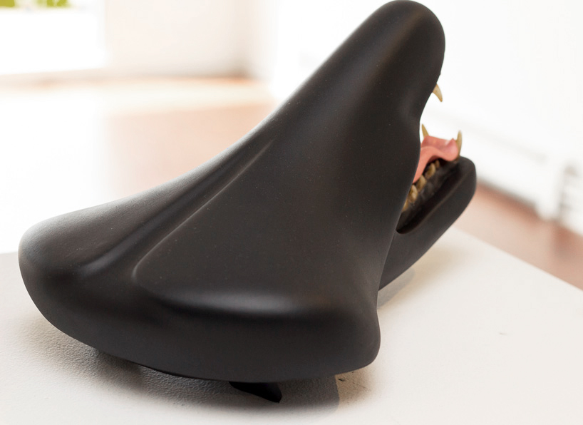 主要的座墊來源是回收腳踏車,而嘴巴和眼睛則是塑膠模型,看似很亂搞的作品,但是工法卻相當細膩,切口收邊收得很整齊,塑膠模型的擬真度也很高,看那兩排泛黃的尖牙和粉嫩的舌頭,我一點都不懷疑這可能是隻狗狗來著阿XDD