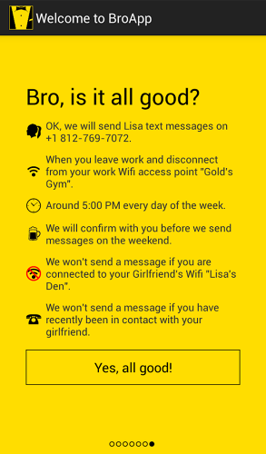 你可以在 BroApp 設定女友的電話,以及希望發送的各種情話和發送時間。BroApp 還會以 Wi-Fi 名稱來確認你是否在女友家,以免發生人在旁邊卻發簡訊的尷尬,並自動避開你剛和女友通話完的時間,不發送簡訊。如果女友不小心解開你手機上 BroApp 的密碼,她也只會看到你準備送給她的禮物清單,而更加愛你。