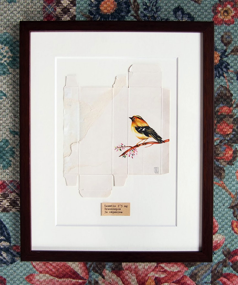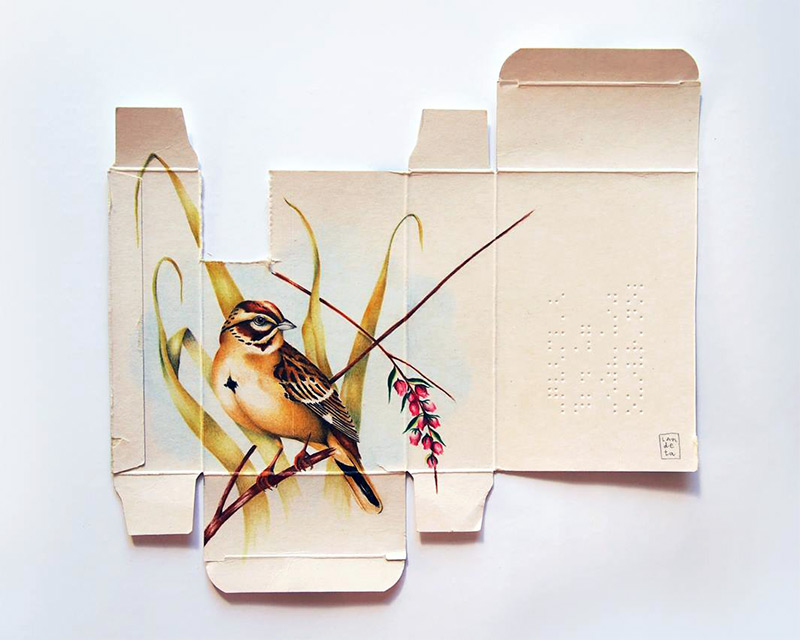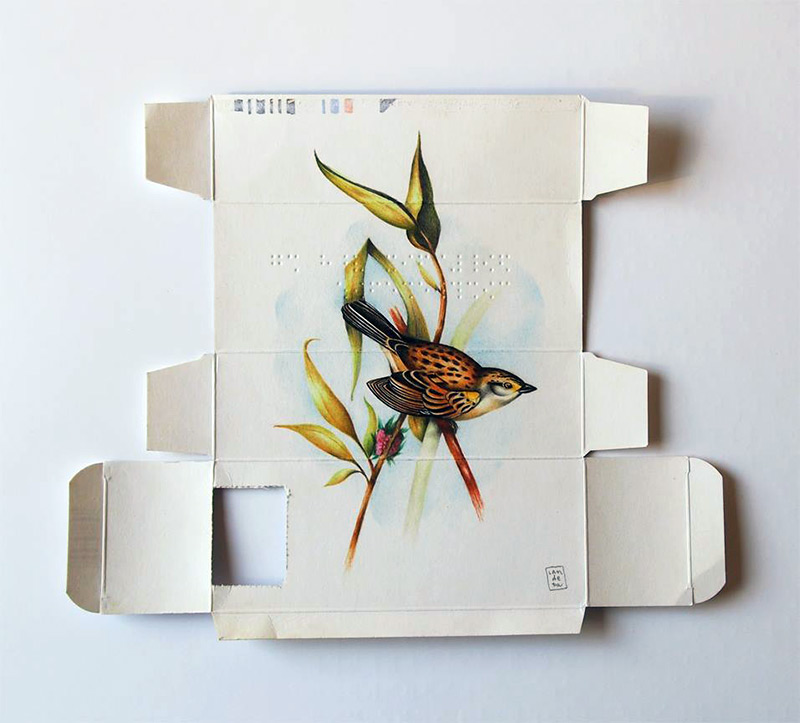 來自西班牙馬德里的藝術家 Sara Landeta 有一雙細緻巧手,不只因為描繪得相當傳神,而是她所用的紙張都不大,都是來自藥品的外包裝紙盒,要在這樣的面積下作畫並不容易,而 Sara Landeta 則掌握得恰到好處,以色鉛筆勾勒出色彩線條,葉片的深淺漸層和鳥兒的神態都很傳神,雖然我們不一定叫得出這些鳥兒的名稱,但是牠們圓滾滾的體態卻可愛迷人!目前 Sara Landeta 仍在持續這個花鳥系列創作,有興趣的人可以到她的臉書或者部落格追蹤新訊息喔!