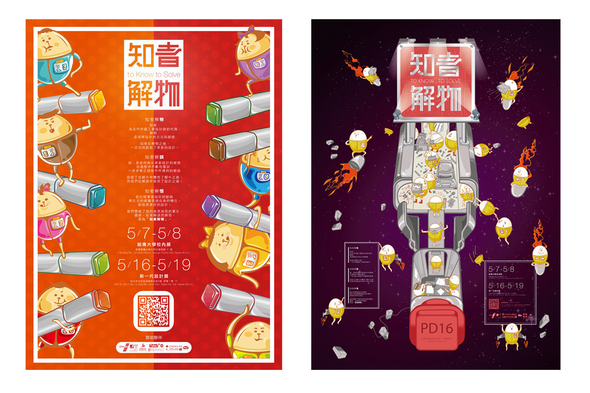 全心嚮往投入的設計工作,必須要能找到問題與應對的方法,才能實際符合大眾的需求,為人所用。有別於一般的工業設計學系,銘傳商品設計系更多了一份人文素養與社會關懷。在本屆畢業設計展中,力求突破以往給人較抽象、嚴謹的印象,而選擇以活潑、可愛的視覺呈現整體概念,並應用在文宣、活動或展場佈置上。為今年的主題而誕生的公仔「知知」與「解解」,便是希望能藉此更貼近群眾,讓設計的思維能更直接地和觀眾互動、碰撞出新的刺激。