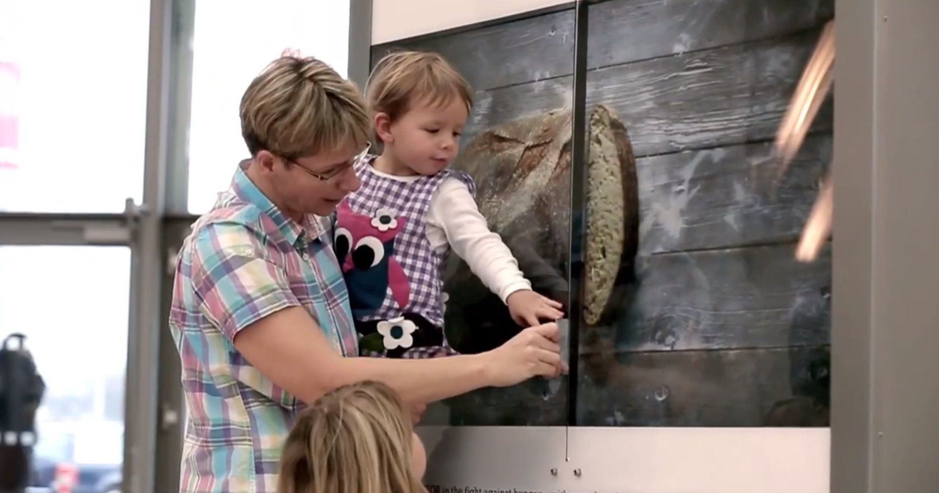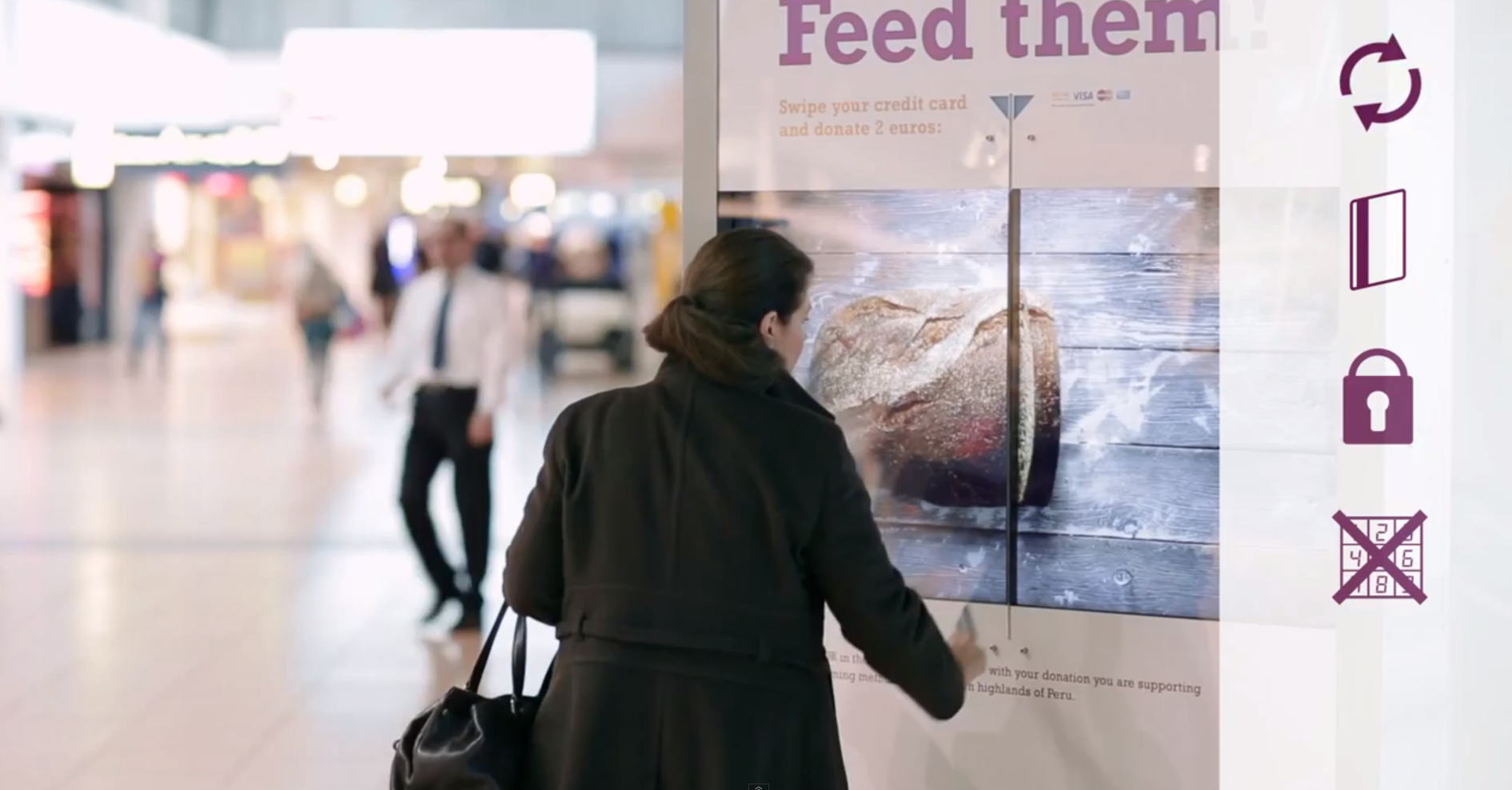 隨著時代進步,捐款的宣傳方式也進步了,德國公益組織 Misereor 在國際機場放置一台大型互動式螢幕,當路過的旅客以信用卡劃過螢幕中央的刷卡機後,系統業者就會自動扣款兩歐元,而螢幕畫面也會跟著變化:原本被束縛的雙手重新獲得自由,或者麵包被切開、飢餓的狀況獲得改善,透過互動影像的方式,讓捐款人馬上感受到自己捐出的兩歐元可能達到的效益!